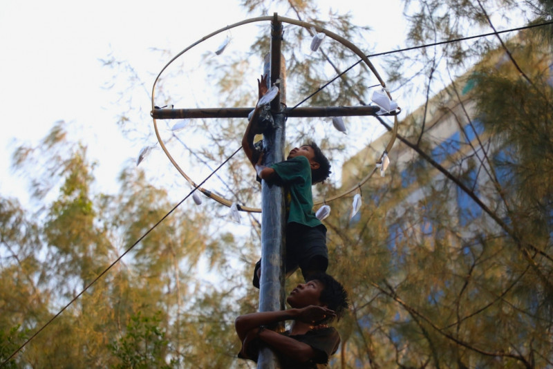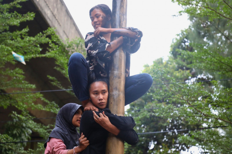 Lomba Panjat Pinang di Kebon Sirih Diikuti Kaum Ibu