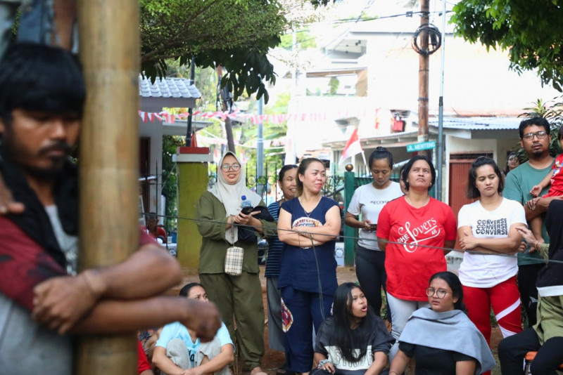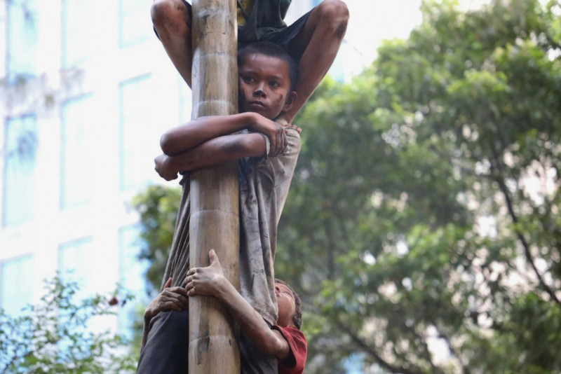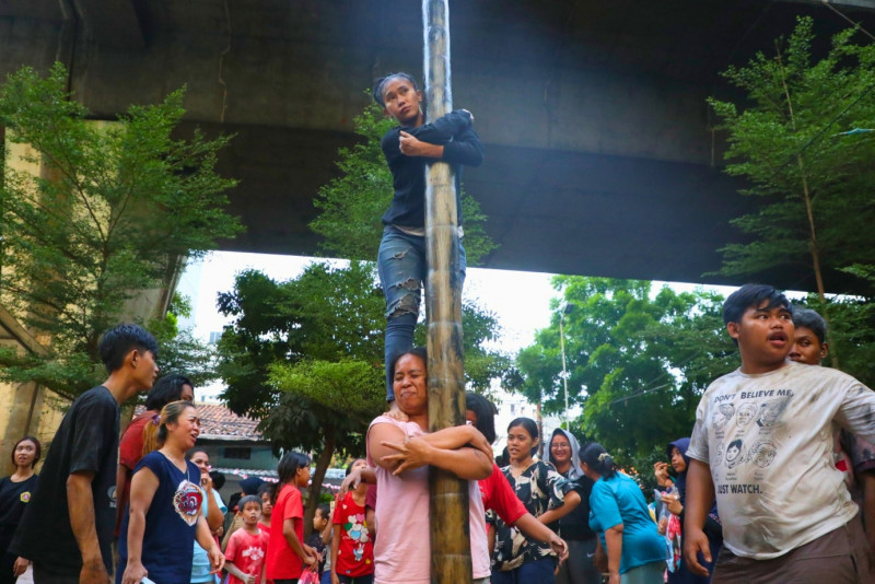 Warga RW 07, Kebon Sirih, Menteng, Jakarta Pusat memeriahkan perayaan HUT ke-78 Kemerdekaan RI dengan mengikuti lomba panjat pinang di RPTRA Kebon Sirih, Jalan Srikaya, RT 15/07, Kamis (17/8). Biasanya, lomba panjat pinang ini hanya diikuti oleh laki-laki namun kali ini diikuti juga kaum ibu.