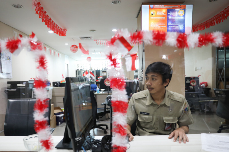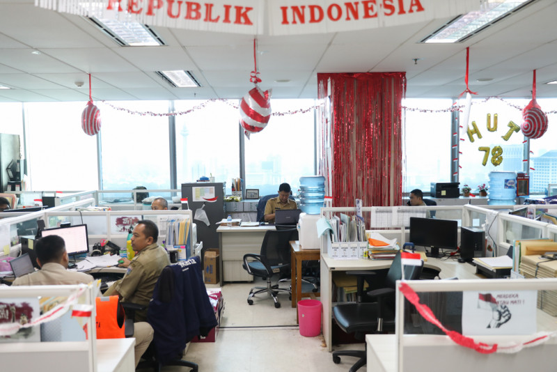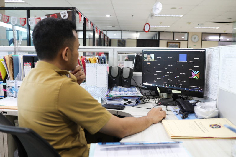 Melihat suasana kerja aparatur sipil negara (ASN) Pemerintah Provinsi (Pemprov) DKI Jakarta disaat penerapan work from home (WFH) atau bekerja dari rumah sebanyak 50 persen di Blok G Balai Kota DKI Jakarta, Gambir, Jakarta Pusat, Senin (21/8). Kebijakan work from home (WFH) atau bekerja dari rumah dilakukan dari 21 Agustus hingga 21 Oktober 2023.