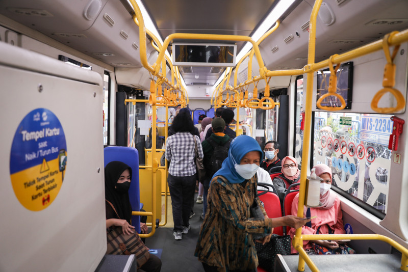 Sejumlah bus listrik mengangkut penumpang di Halte Transjakarta Terminal Blok M, Kebayoran Baru, Jakarta Selatan, Senin (21/8). PT Transportasi Jakarta (Transjakarta) akan menambahkan jumlah armada bus listrik sekitar 500 armada berukuran besar dan medium pada 2024 dan 2025 secara bertahap. Penambahan armada berbasis listrik tersebut untuk mengurangi emisi karbon sebagai upaya untuk meningkatkan kualitas udara di Jakarta.