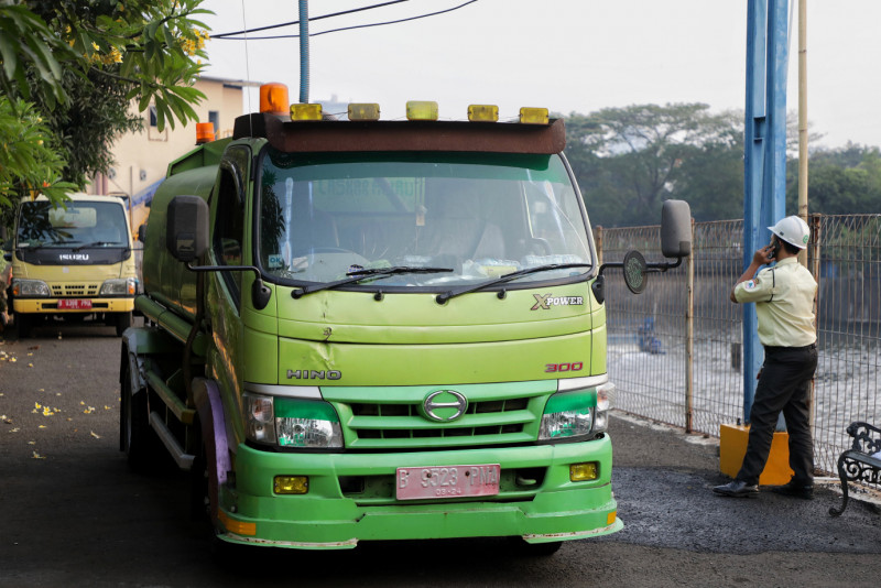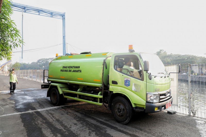 Dinas Pertamanan dan Hutan Kota (Distamhut) DKI Jakarta mengisi air untuk penyiraman tanaman di IPAL Setiabudi, Jalan HOS Cokroaminoto, Guntur, Setiabudi, Jakarta Selatan, Rabu (23/8). Untuk memenuhi kebutuhan air setiap harinya, Distamhut bekerjasama dengan Paljaya dalam ketersediaan air yang sudah diolah atau tidak berbau untuk penyiraman tanaman pelindung ataupun tanaman hias yang berada di ruas jalan dan fasilitas umum. Penyiraman tanaman terus dilakukan sebagai upaya mengurangi polusi udara di DKI Jakarta.