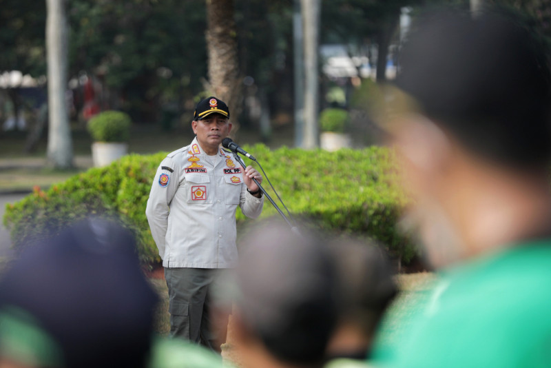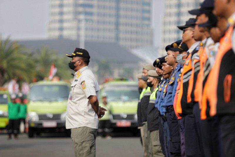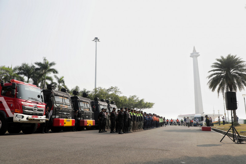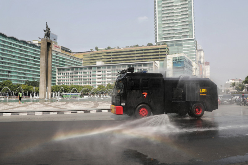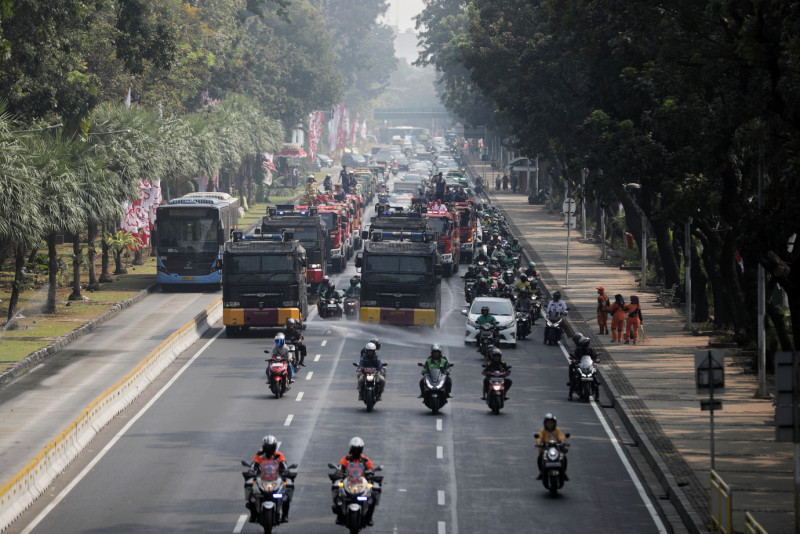 Pemerintah Provinsi (Pemprov) DKI Jakarta dan Polda Metro Jaya melakukan penyiraman di kedua sisi sepanjang Jalan Medan Merdeka Barat hingga Patung Pemuda Membangun Senayan, Jakarta Pusat, Rabu (23/8). Kegiatan ini merupakan upaya Pemprov DKI Jakarta dalam mengembalikan kualitas udara di Jakarta menjadi lebih baik serta mewujudkan kota Jakarta lebih cantik, bersih dan sehat.