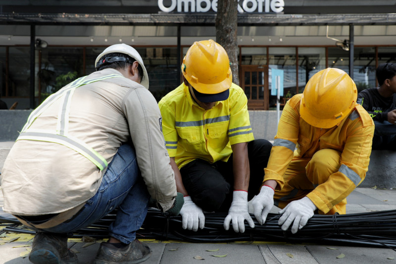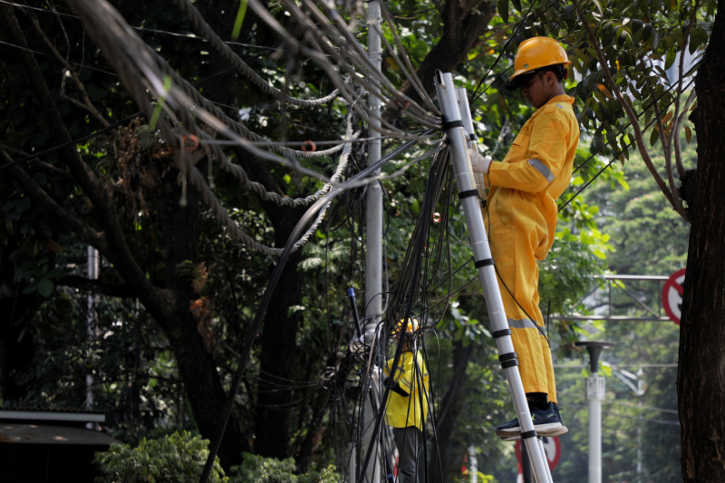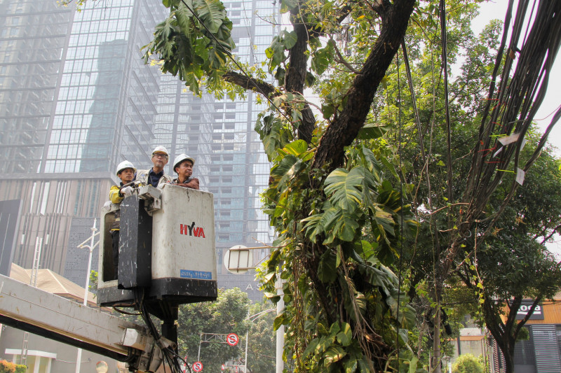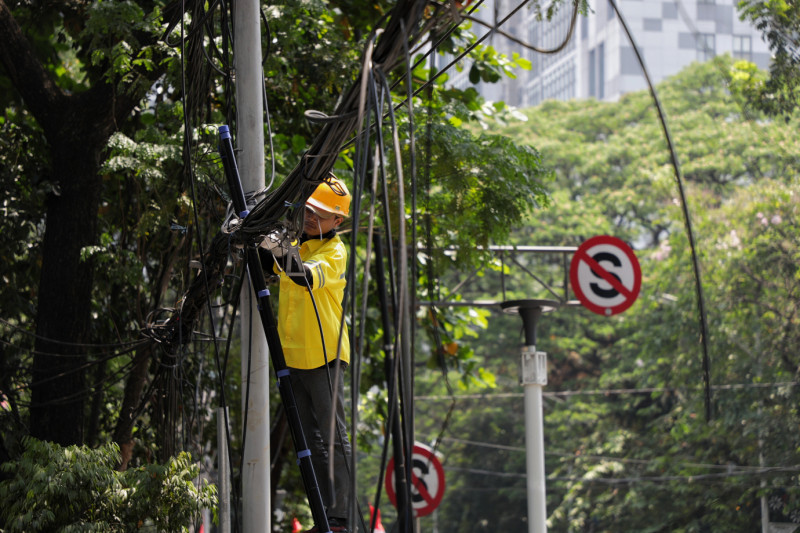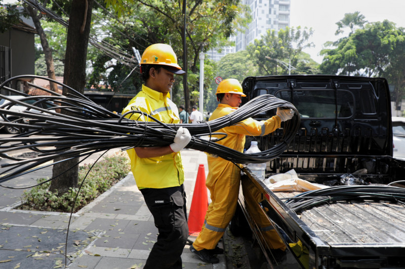 Dinas Bina Marga DKI Jakarta bersama Jakarta Infrastruktur Propertindo (JIP) merelokasi kabel udara di Jalan Senopati, Selong, Kebayoran Baru, Jakarta Selatan, Kamis (24/8). Kepala Bidang Prasarana Sarana dan Utilitas Kota (PSUK) Dinas Bina Marga Provinsi DKI Jakarta, Syamsul Bakhri mengatakan, hari ini dilakukan pemotongan pada 28 kabel udara yang sudah tidak aktif maupun yang masih aktif, dengan rincian 15 kabel besar dan 13 kabel kecil milik operartor-operator komunikasi.