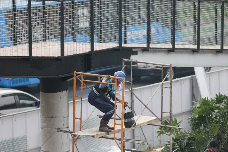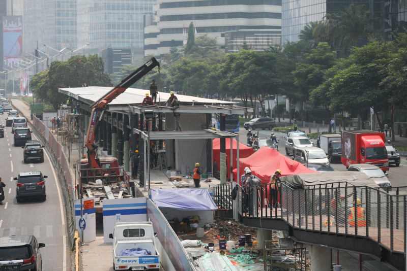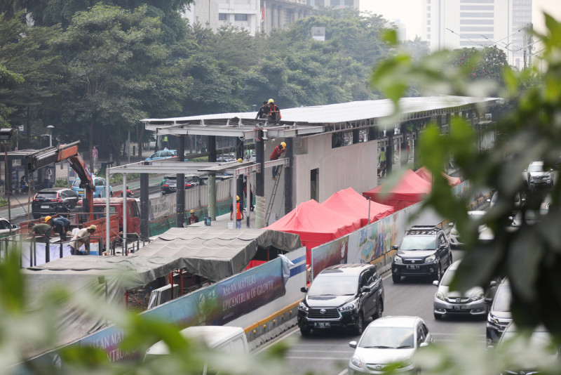 Sejumlah pekerja melakukan pengerjaan revitalisasi Halte Transjakarta Karet di Jalan Jenderal Sudirman, Setiabudi, Jakarta Selatan, Sabtu (26/8). Halte yang direvitalisasi sejak 31 Mei 2023 tersebut ditargetkan akan beroperasi dan melayani penumpang kembali pada bulan September 2023.