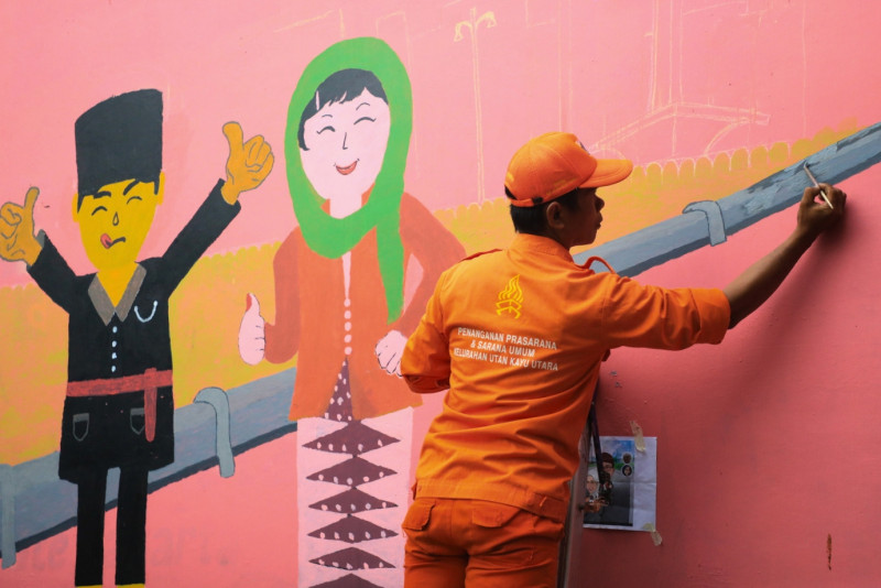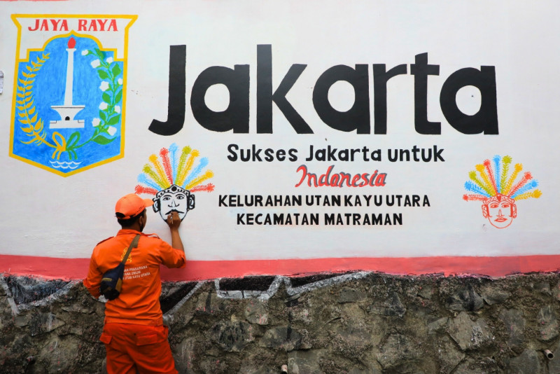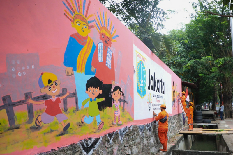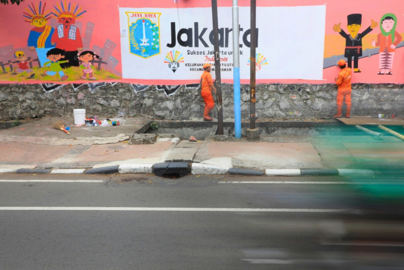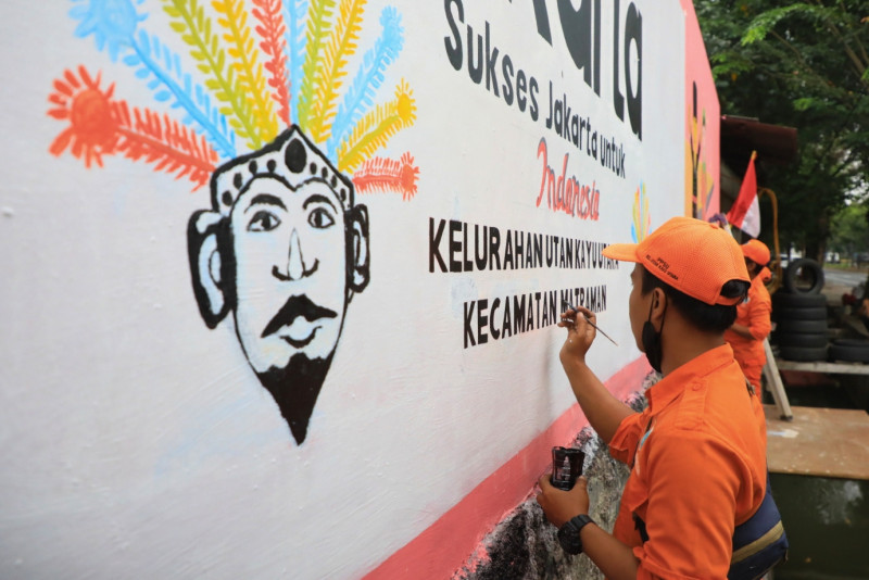 Sebanyak tiga petugas Penanganan Prasarana dan Sarana Umum (PPSU) Kelurahan Utan Kayu Utara membuat mural di Jalan Pramuka Raya, Matraman, Jakarta Timur, Senin (28/8). Pembuatan mural sepanjang delapan meter dan lebar 2,5 meter ini dilakukan sejak 25 Agustus 2023 dan ditargetkan rampung pada 30 Agustus 2023 dengan tema budaya khas Jakarta diharapkan menambah keindahan lingkungan.