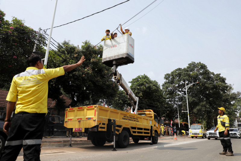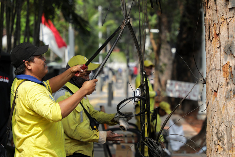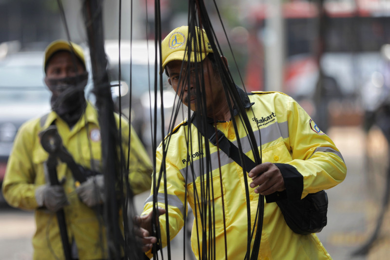 Dinas Bina Marga Provinsi DKI Jakarta melakukan pemotongan kabel udara di Jalan Sunan Kalijaga, Kelurahan Melawai, Kebayoran Baru, Jakarta Selatan, Senin (28/8). Pemotongan kabel ini menyasar sepanjang Jalan Sunan Kalijaga di kawasan Blok M Jakarta Selatan dengan panjang 936 meter.