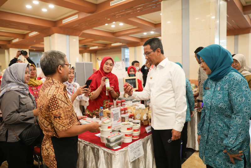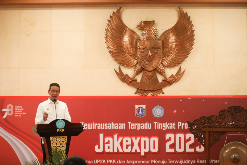 Penjabat (Pj) Gubernur DKI Jakarta, Heru Budi Hartono membuka Bazar Pengembangan Kewirausahaan bagi Kader UP2K/Jakpreneur PKK tingkat Provinsi DKI Jakarta di Ruang Serba Guna Blok G Balai Kota DKI Jakarta Selasa (29/8). Bazar dengan berbagai macam kuliner dan kerajinan tangan tersebut digelar pada 29 - 31 Agustus 2023.