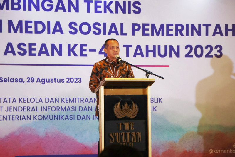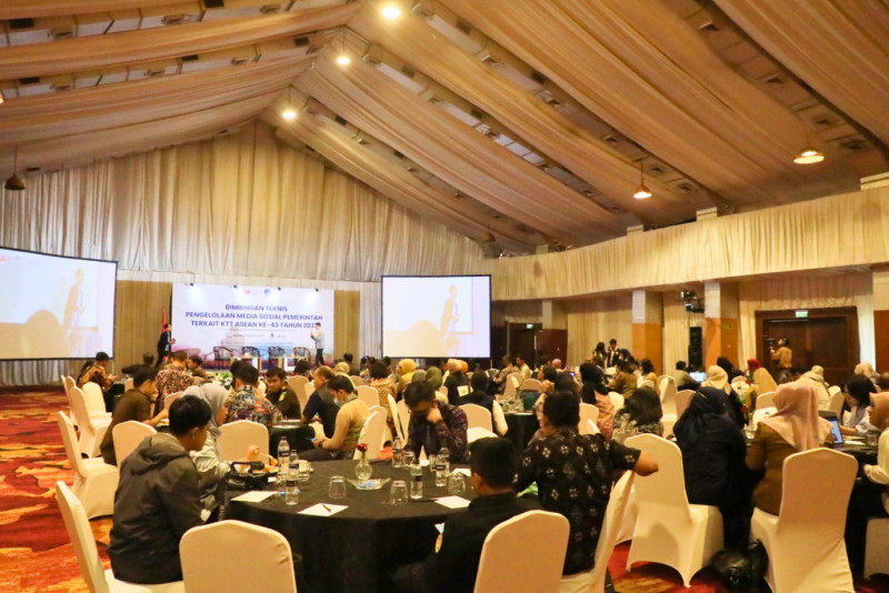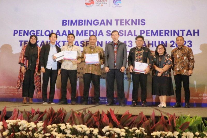 Kementerian Komunikasi dan Informatika (Kemenkominfo) RI menggelar Bimbingan Teknis Pengelolaan Media Sosial Pemerintah Terkait Konferensi Tingkat Tinggi (KTT) ASEAN ke-43 Tahun 2023 di Hotel Sultan, Jalan Gatot Subroto, Gelora, Tanah Abang, Jakarta Pusat, Selasa (29/8). Kegiatan ini diikuti Dinas Komunikasi Informatika dan Statistik (Kominfotik) se-Indonesia, Kementerian dan sejumlah lembaga lainnya, dengan jumlah 400 peserta dengan persentase 100 luring dan 300 secara daring. Bimtek ini digelar untuk meningkatkan kemampuan pengelolaan media sosial pemerintah meliputi penguatan nation branding untuk membangun persepsi postif di mata publik.
