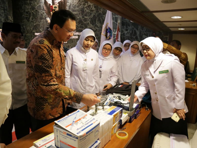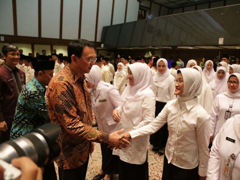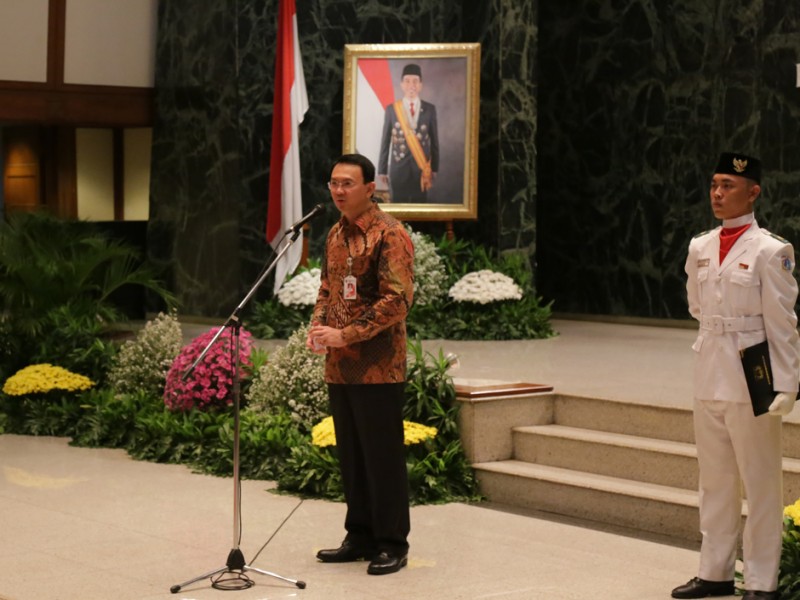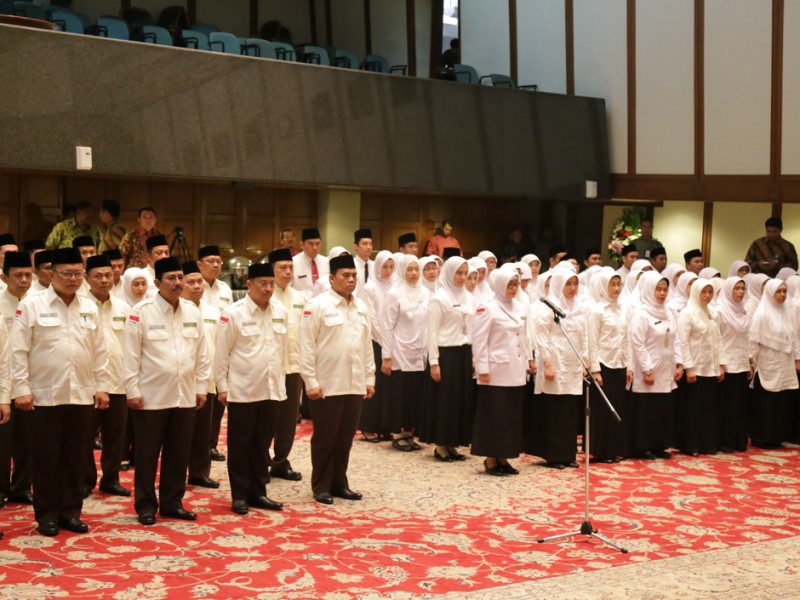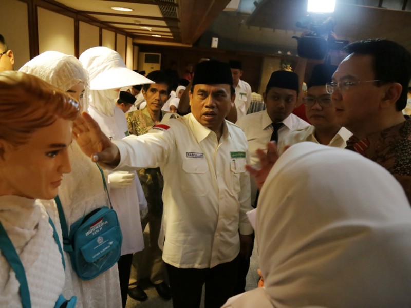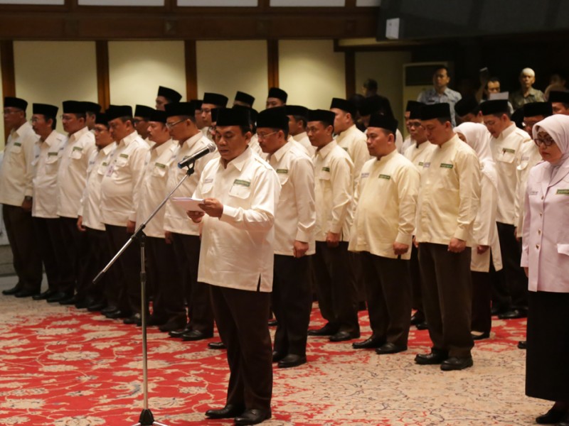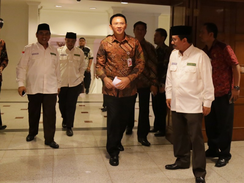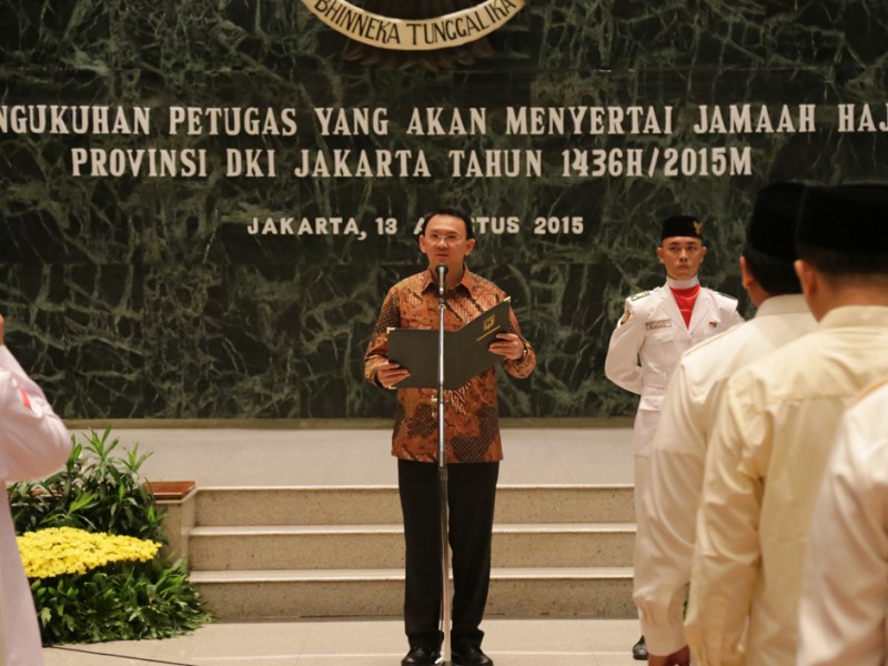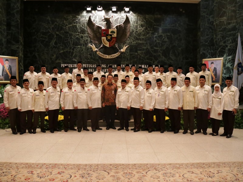 Gubernur DKI Jakarta, Basuki Tjahaja Purnama mengukuhkan petugas yang menyertai jamaah Haji asal Provinsi DKI Jakarta di Balaikota DKI Jakarta, Kamis (13/08/2015). Selain mengukuhkan Saefullah sebagai Kafilah Haji asal Provinsi DKI Jakarta, Basuki juga mengukuhkan 105 petugas Haji, dengan rincian 65 petugas Haji dari pusat dan 40 petugas Haji berasal dari Provinsi DKI Jakarta. (Foto: Reza/beritajakarta.com)