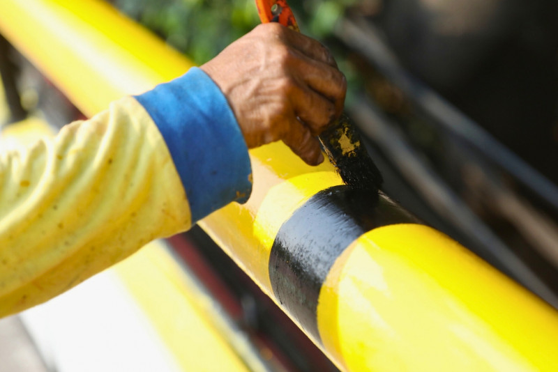 Petugas Suku Dinas Bina Marga Jakarta Pusat melakukan pengecatan Railing Flyover di Jalan Hos Cokroaminoto, Menteng, Jakarta Pusat, Rabu, (30/8). Pengecatan sepanjang 374 meter ini dilakukan untuk mempercantik kawasan dan menyambut penyelengaraan Konferensi Tingkat Timggi (KTT) ASEAN.