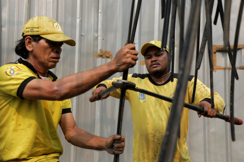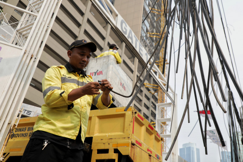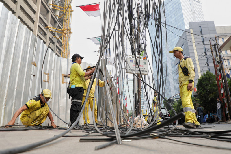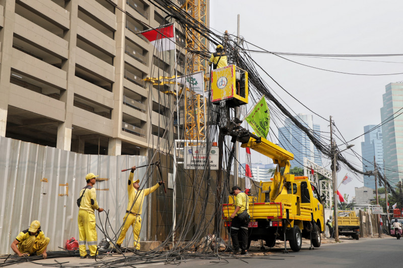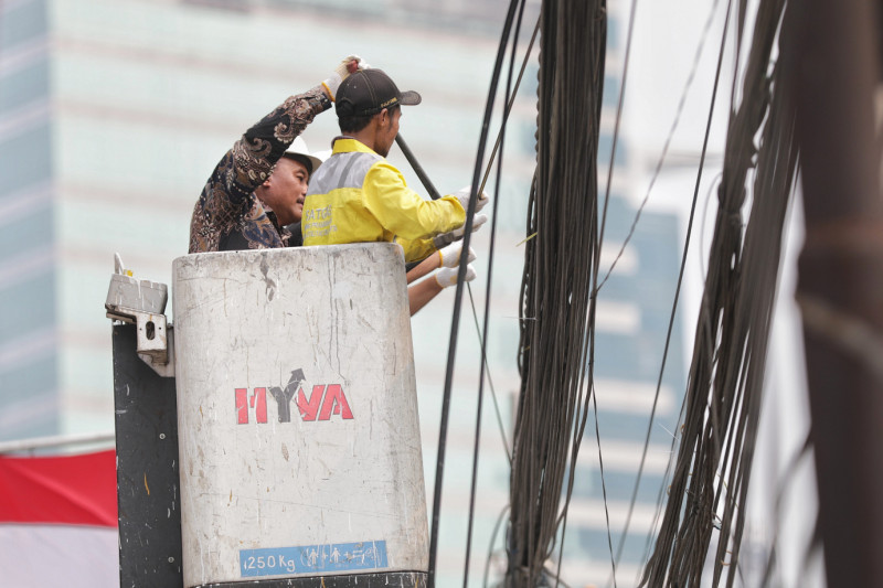 Dinas Bina Marga Provinsi DKI Jakarta melakukan pemotongan kabel udara di Jalan Guru Mughni, Karet Semanggi, Setiabudi, Jakarta Selatan, Kamis (31/8). Pemotongan kabel udara hari ini Dinas Bina Marga bersama stekholder terkait melakukan pemotongan terhadap 84 kabel utilitas dari 17 operator komunikasi sepanjang 620 meter.