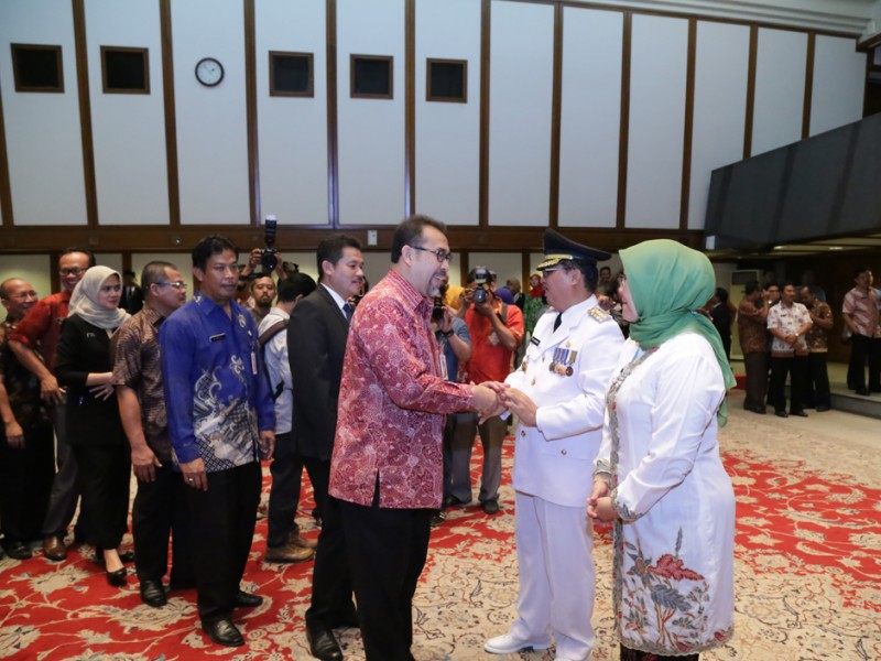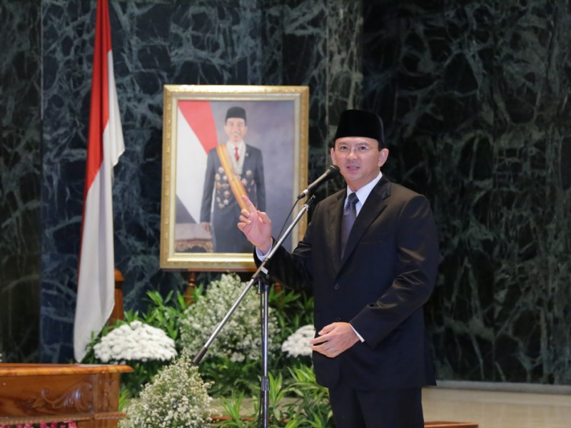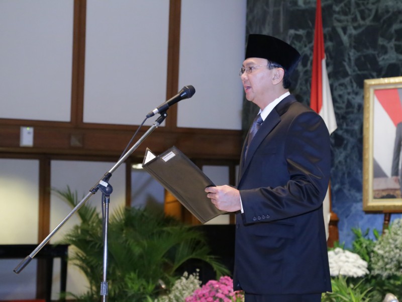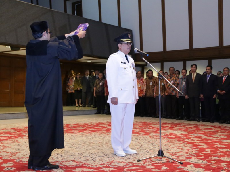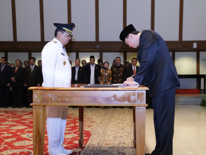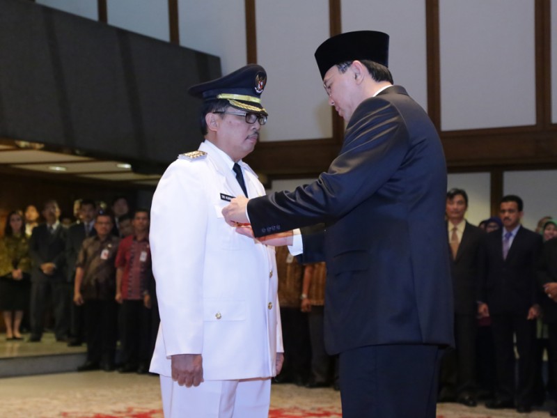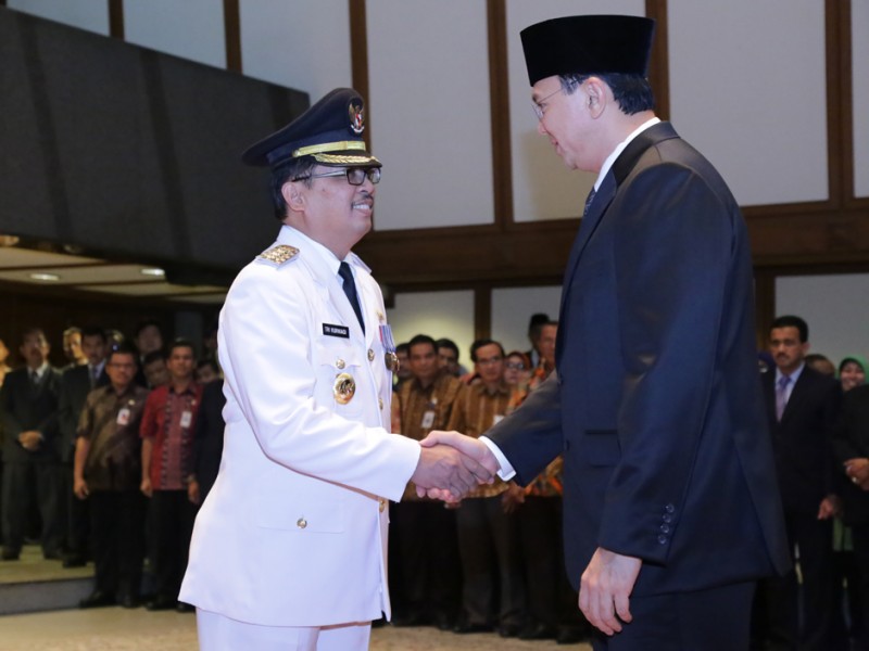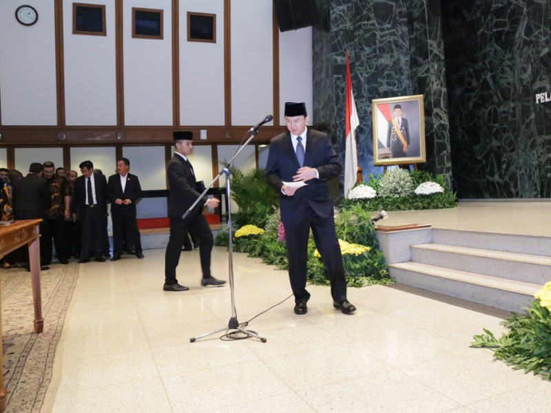 Gubernur DKI Jakarta, Basuki Tjahaja Purnama melantik Tri Kurniadi menjadi Walikota Jakarta Selatan menggantikan posisi Syamsuddin Noor. Dalam kesempatan tersebut, Basuki meminta Tri Kurniadi untuk bekerja keras membangun Jakarta Selatan menjadi lebih bersih dan tertata. (Foto: Yopie/beritajakarta.com)