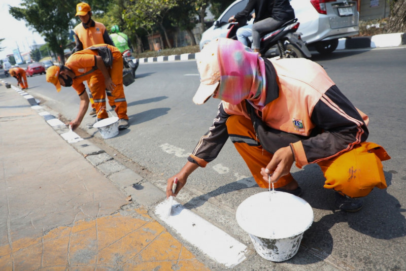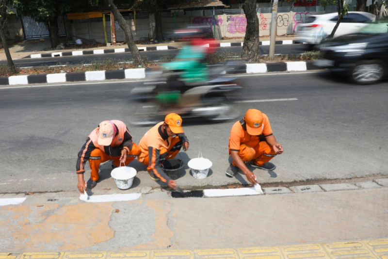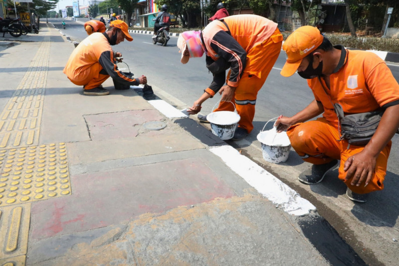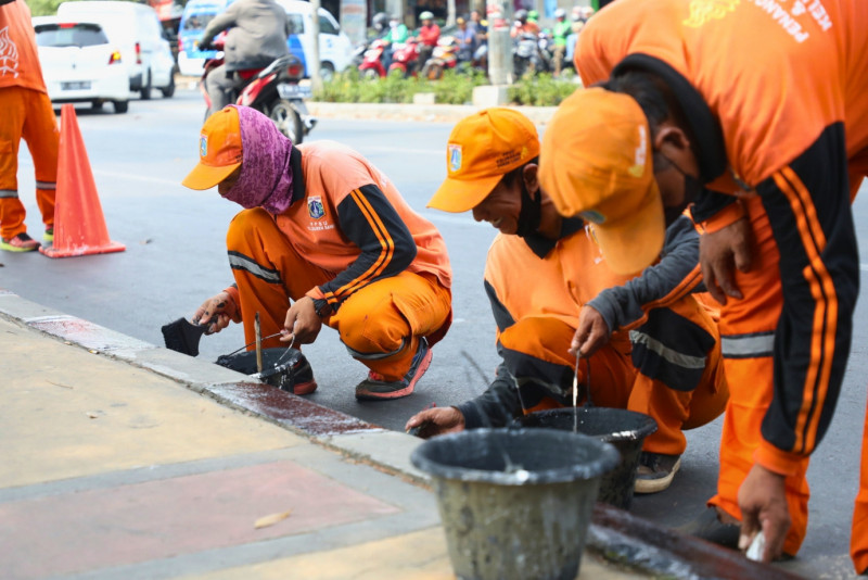 20 petugas Penanganan Prasarana dan Sarana Umum (PPSU) Kelurahan Duren Sawit melakukan pengecatan kastin trotoar di Jalan Radin Inten, Duren Sawit, Jakarta Timur, Selasa (05/9). Pengecatan sepanjang 3 kilometer ini dilakukan karena sebelumnya warna kastin trotoar mulai memudar sehingga harus segera dilakukan pengecatan ulang.