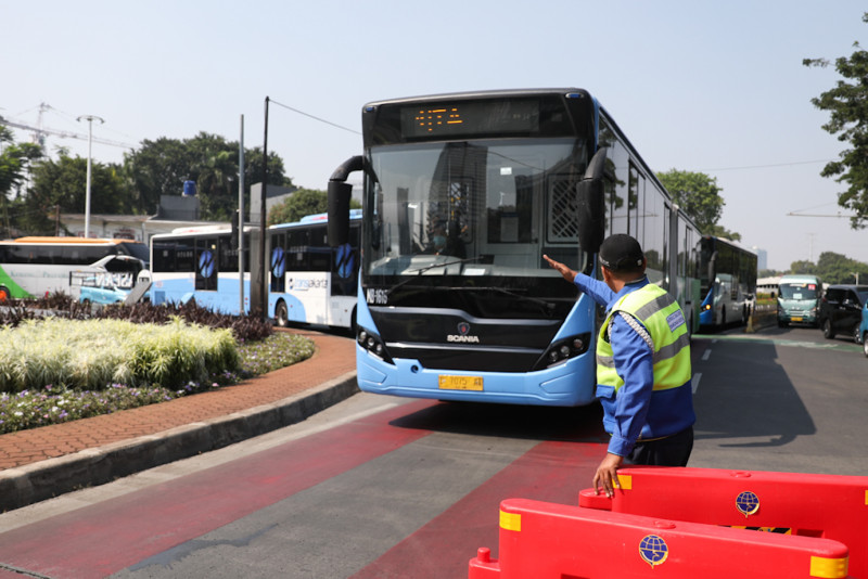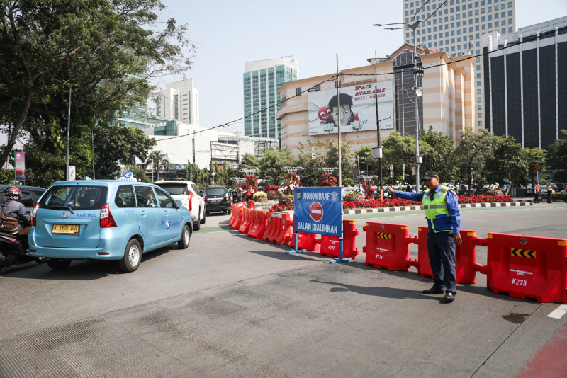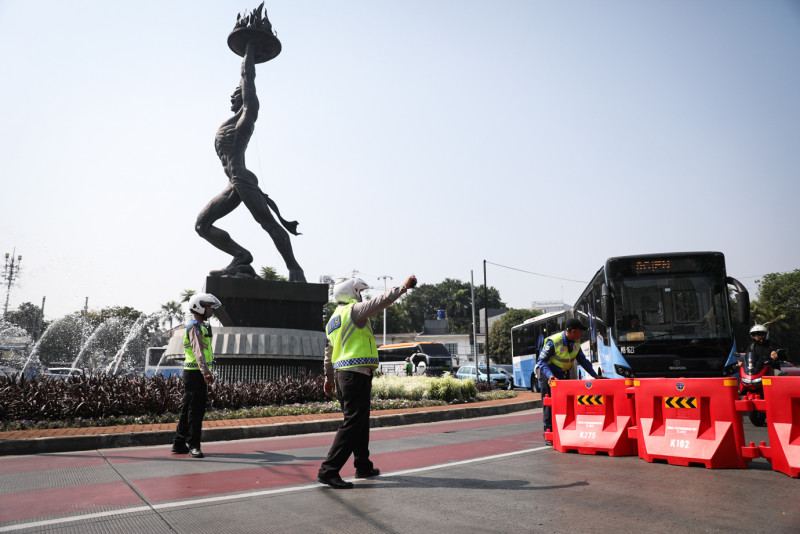 Sejumlah petugas gabungan dari unsur Polri, Dinas Perhubungan (Dishub) DKI Jakarta dan petugas Transjakarta mengatur rekayasa lalu lintas di Bundaran Senayan, Jalan Jenderal Sudirman, Kebayoran Baru, Jakarta Selatan, Selasa (05/9). Dishub DKI Jakarta melakukan rekayasa lalu lintas di 29 ruas jalan sekitar lokasi seluruh rangkaian acara KTT ASEAN ke-43 serta lokasi menginap para delegasi.