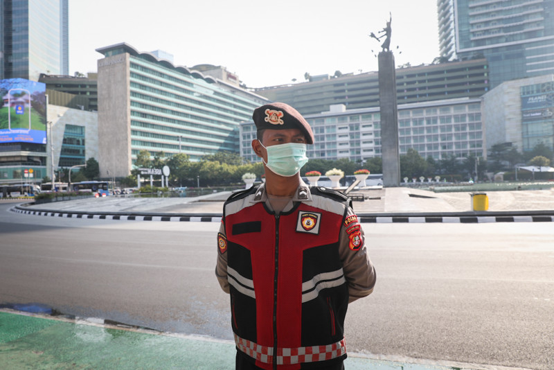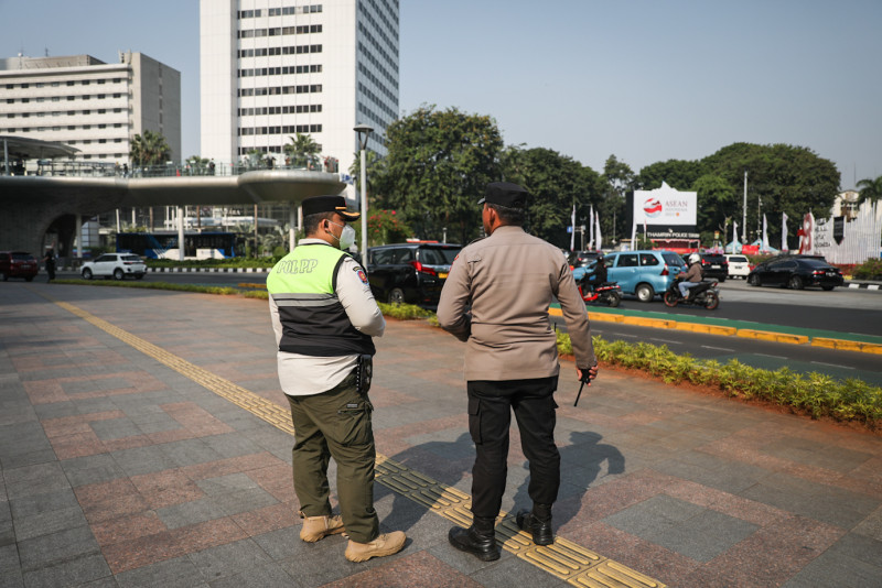 Petugas gabungan dari Kepolisian RI dan Satpol PP DKI Jakarta melakukan pengamanan KTT ASEAN ke-43 di kawasan Bundaran Hotel Indonesia, Jalan Sudirman-Thamrin, Menteng, Jakarta Pusat, Rabu (6/9). Pengamanan ekstra dilakukan di jalur-jalur yang dilalui oleh delegasi negara peserta KTT menuju lokasi acara dan tempat menginap.