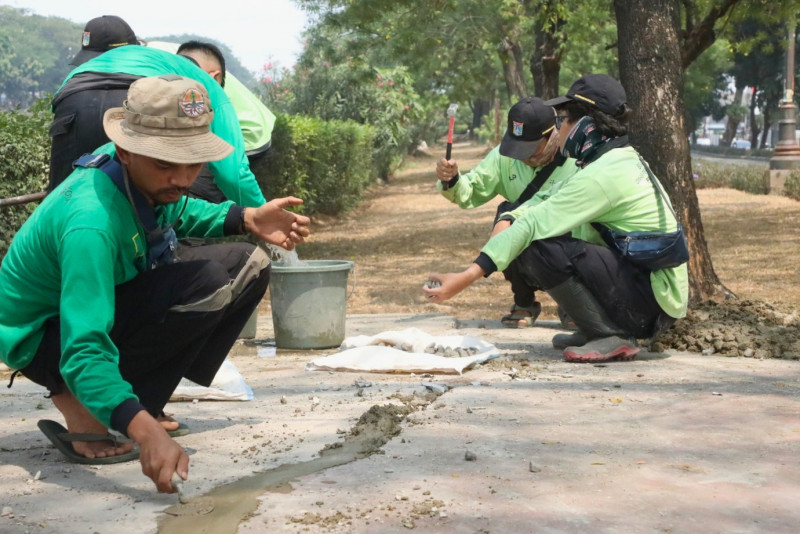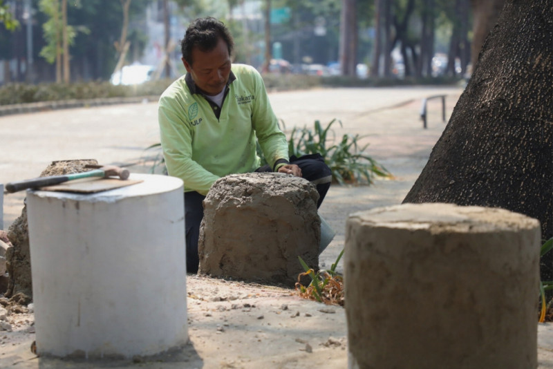 Petugas Dinas Pertamanan dan hutan Kota melakukan perbaikan fasilitas taman di Kanal Banjir Timur (KBT) Jalan Kolonel Sugiono, Duren Sawit, Jakarta Timur, Kamis (7/9). Dalam perbaikan ini petugas memperbaiki sejumlah fasilitas yang rusak seperti bangku taman dan sejumlah lantai yang rusak. Perbaikan ini dilakukan untuk memberikan kenyamanan bagi sejumlah warga yang berkunjung ke kawasan Kanal Banjir Timur.