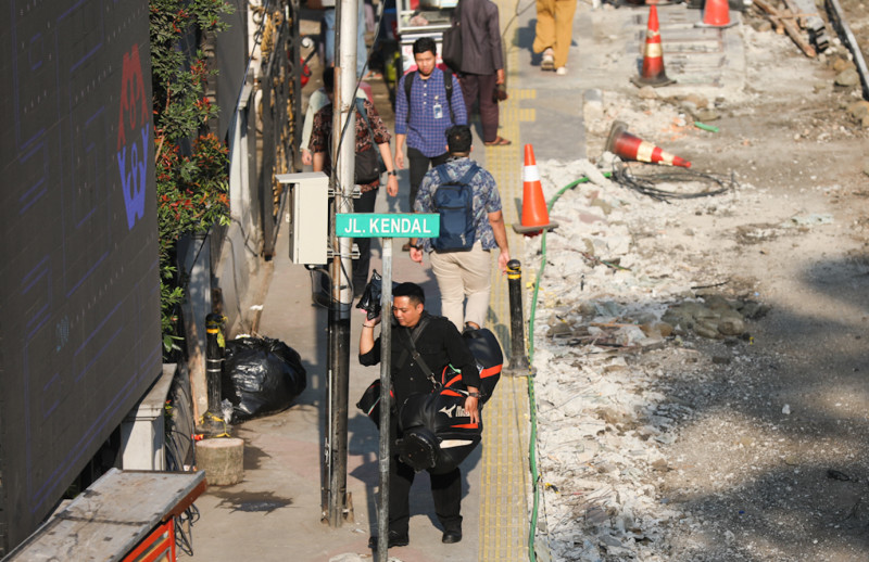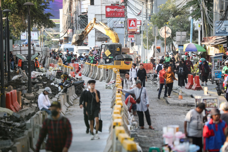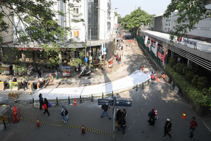 Sejumlah pekerja melakukan pengerjaan area pedestrian di Jalan Blora dan Jalan Kendal, Kecamatan Menteng, Jakarta Pusat, Senin (11/9). PT MRT Jakarta melakukan pedestrianisasi di sebagian ruas jalan tersebut untuk perluasan plaza transit antara Stasiun Sudirman dan Stasiun MRT Dukuh Atas serta penyediaan area pejalan kaki menuju Jembatan Penyebarangan Multifungsi (JPM) Dukuh Atas.