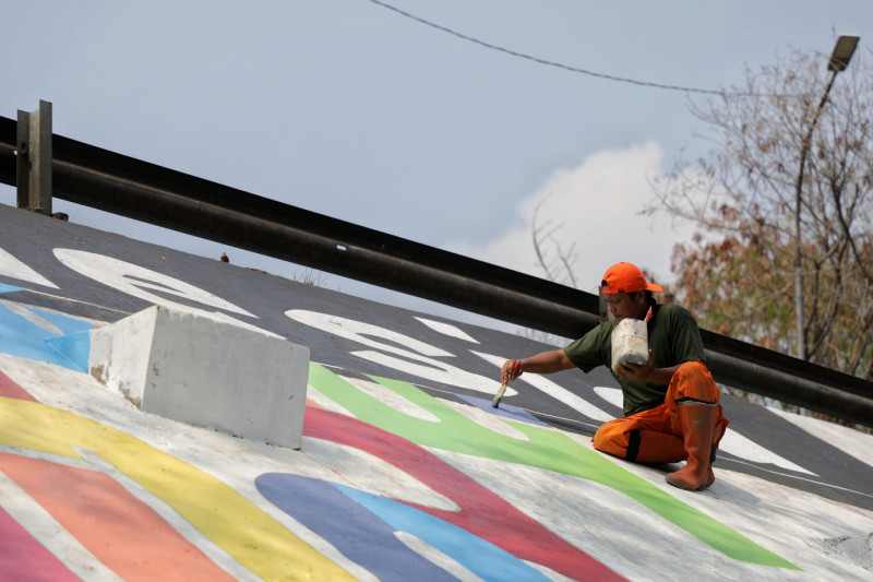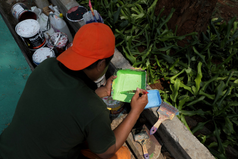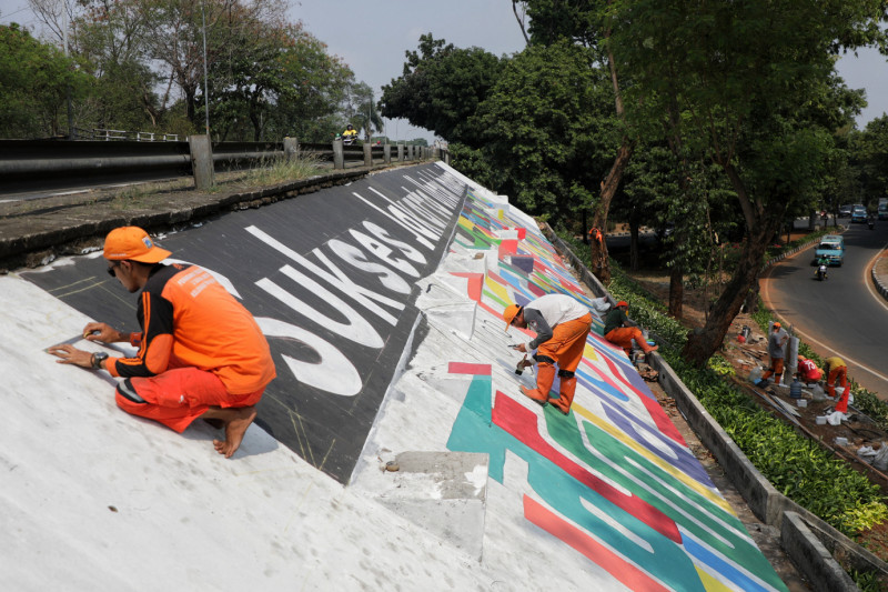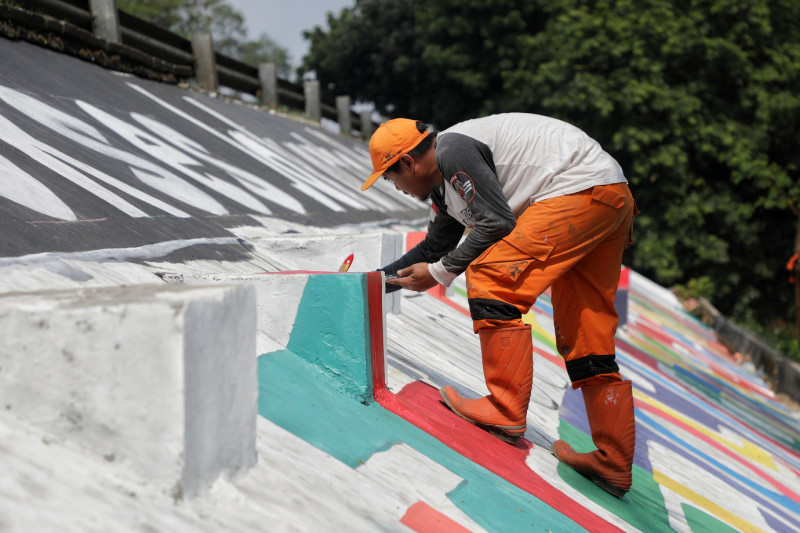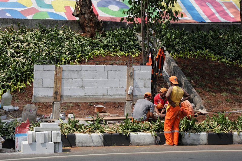 Petugas Penanganan Prasarana dan Sarana Umum (PPSU) Srengseng Sawah menyelesaikan penataan kawasan unggulan di Jalan Raya Lenteng Agung, Jagakarsa, Jakarta Selatan, Senin (11/9). Penataan kawasan tersebut diawali dengan pengerjaan pembatas jalan, penghijauan dengan tanaman lindung dan produktif, lalu dilanjut pengerjaan mural. Saat ini pengerjaan sudah mencapai 50 persen dan ditargetkan rampung pada 25 September mendatang.