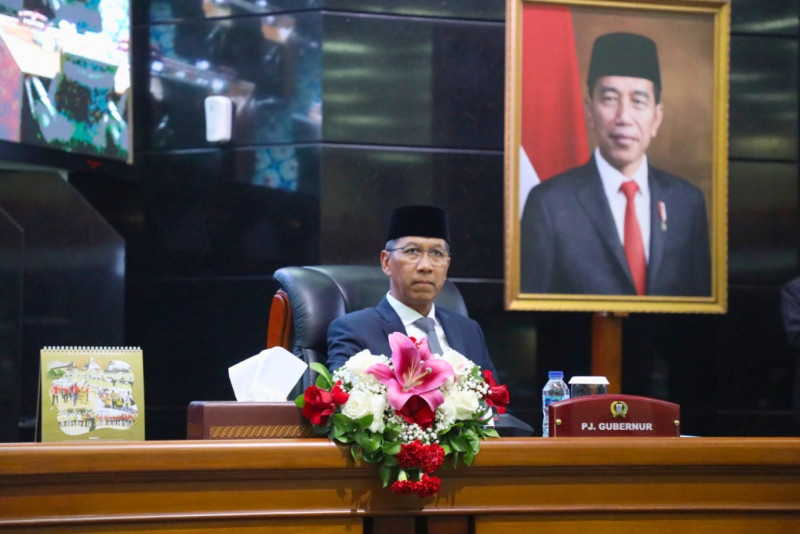 Penjabat (PJ) Gubernur DKI Jakarta, Heru Budi Hartono menghadiri rapat paripurna di Ruang Rapat DPRD DKI Jakarta, Jalan Kebon Sirih, Gambir, Jakarta Pusat, Senin (11/9). Rapat Paripurna beragendakan penyampaian pidato Pj Gubernur mengenai Rancangan Peraturan Daerah (Raperda) tentang perubahan APBD Provinsi DKI Jakarta Tahun Anggaran 2023.