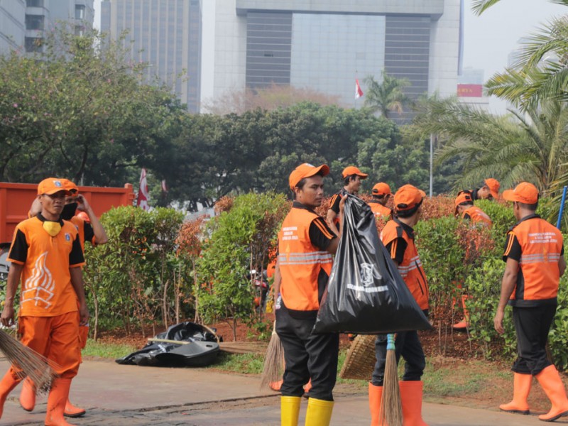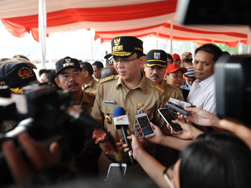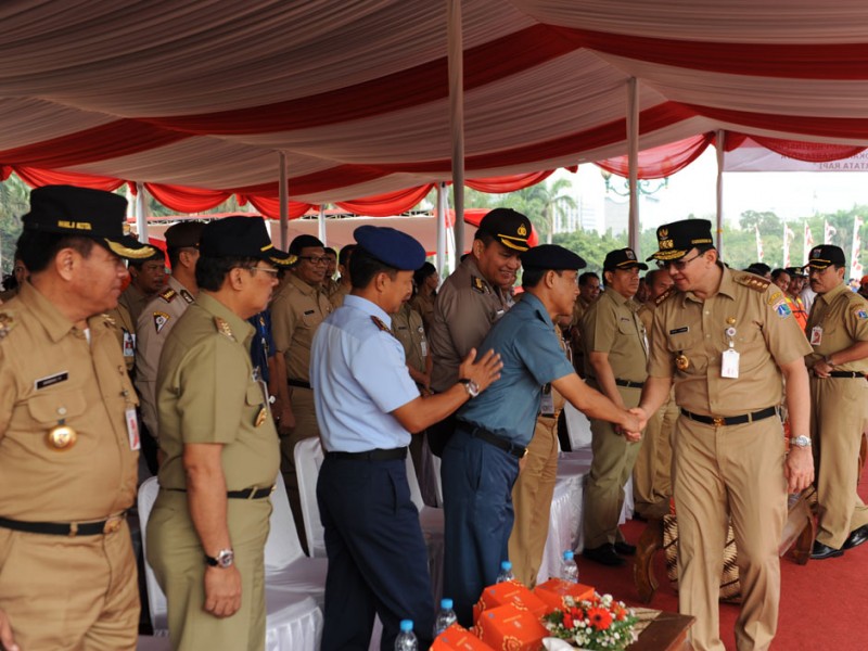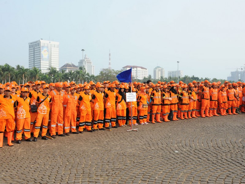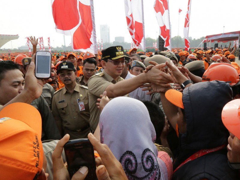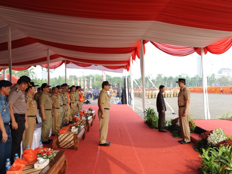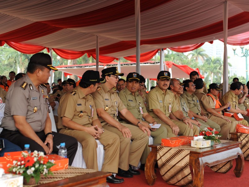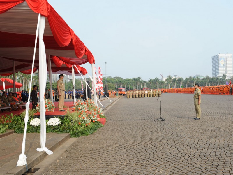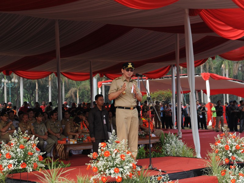 Gubernur DKI Jakarta, Basuki Tjahaja Purnama bertindak sebagai Inspektur dalam apel pekerja Penanganan Prasarana dan Sarana Umum (PPSU) dan Pekerja Harian Lepas (PHL) tahun 2015 di Silang Monas Jakarta sisi selatan, Jakarta Pusat, Sabtu (15/08/2015). Dalam kesempatan ini Basuki menekankan PPSU sangat dibutuhkan untuk melakukan pembenahan di DKI Jakarta, maka kesejahteraan mereka harus kita perhatikan, namun petugas juga harus rajin dan tidak boleh membiarkan kawasan kerja berantakan dan kotor. (Foto: Yopie/beritajakarta.com)