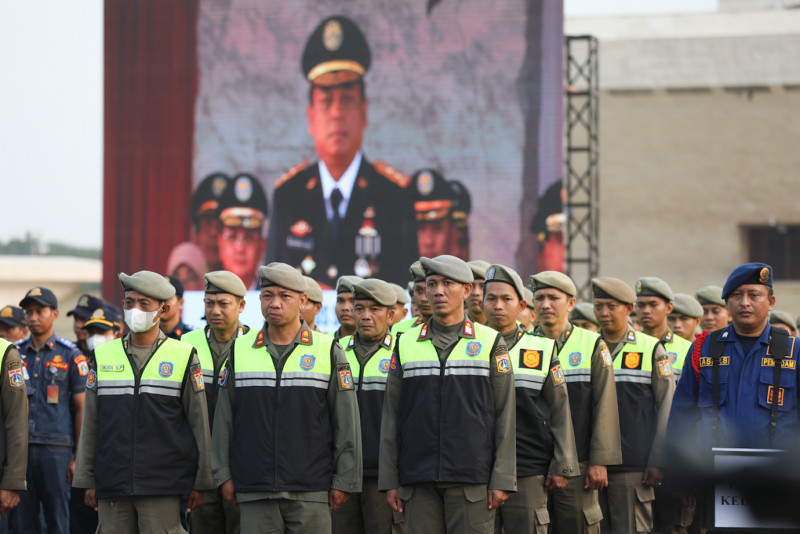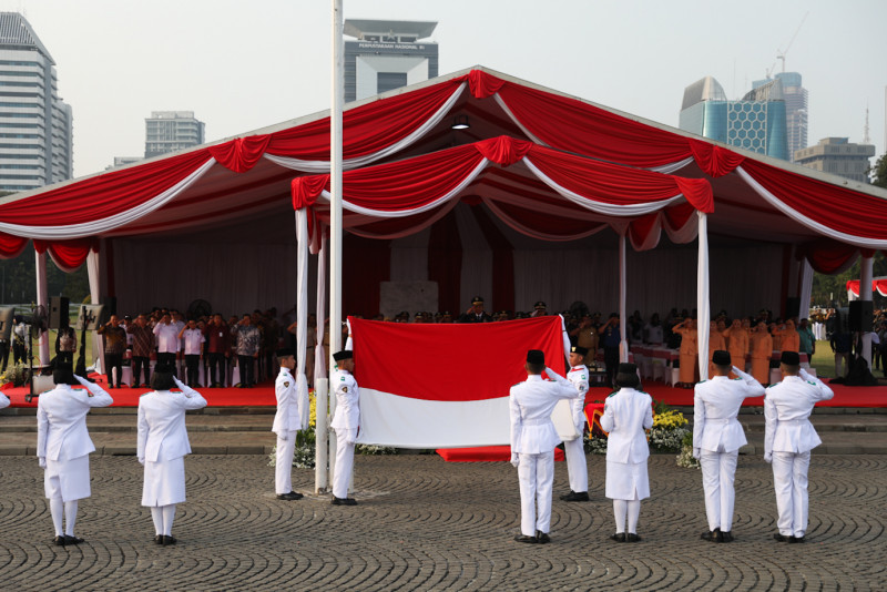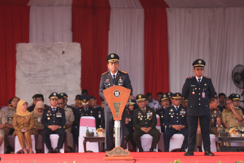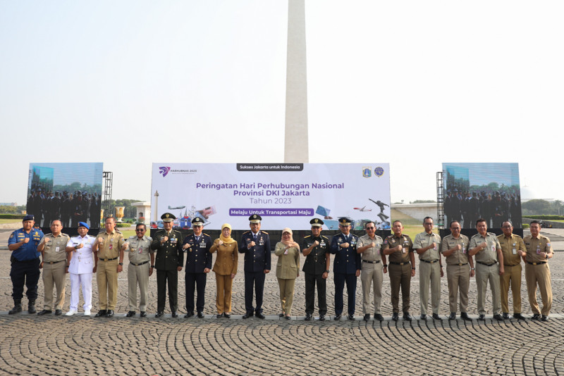 Sekretaris Daerah (Sekda) Provinsi DKI Jakarta, Joko Agus Setyono bertindak sebagai inspektur upacara dalam peringatan Hari Perhubungan Nasional Provinsi DKI Jakarta tahun 2023 di sisi selatan Monumen Nasional, Gambir, Jakarta Pusat, Senin (18/9). Peringatan Hari Perhubungan Nasional tahun 2023 mengusung tema \"Melaju untuk Transportasi Maju\" ini, Sekda memberikan penghargaan Pelopor Keselamatan LLAJ kepada sejumlah pelajar dan pelaku transportasi.
