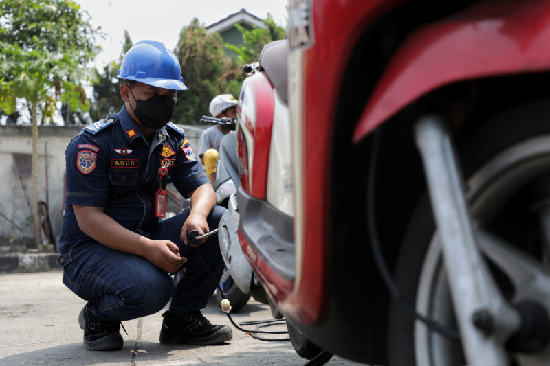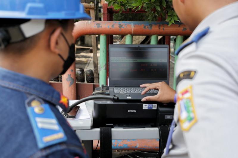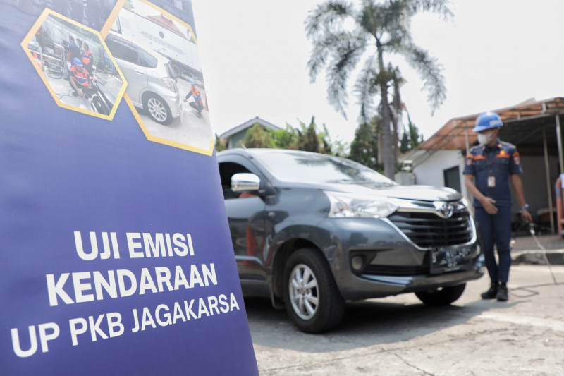 Sejumlah kendaraan bermotor menjalani uji emisi gratis di Terminal Ragunan, Pasar Minggu, Jakarta Selatan, Senin (18/9). Uji emisi yang digelar oleh Dinas Perhubungan DKI Jakarta melalui UP PKB Jagakarsa ini bisa diikuti oleh 30 kendaraan dalam satu hari, baik roda dua maupun roda empat.