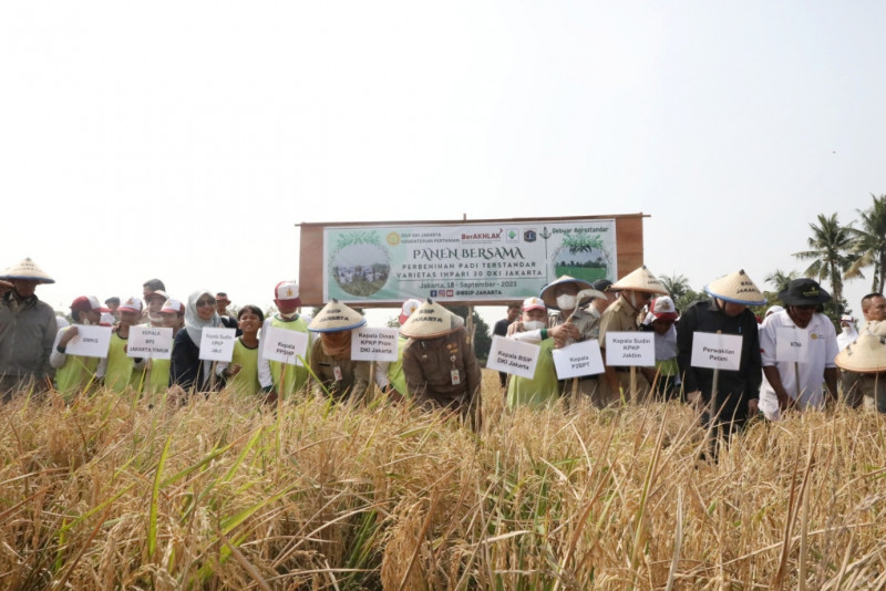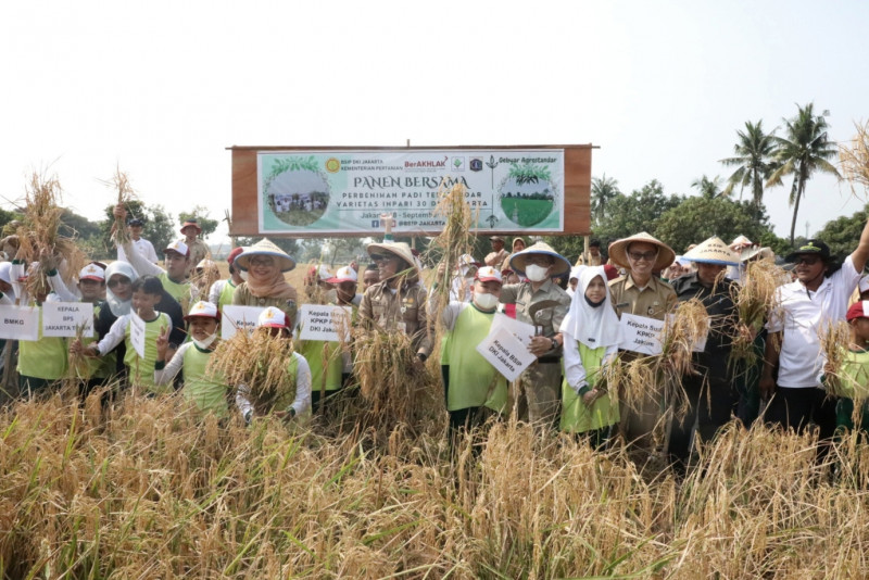 Dinas Ketahanan Pangan, Kelautan, dan Pertanian Provinsi DKI Jakarta bersama Balai Penerapan Standar Instrumen Pertanian (BPSIP) DKI Jakarta menggelar panen bersama 52 pelajar dari SDIT Teladan YPKUI di Kebun Bibit Ujung Menteng, Jalan Tambun Rengas, Ujung Menteng, Cakung, Jakarta Timur, Senin (18/9). Kegiatan ini dilakukan untuk mengedukasi pelajar untuk terlibat langsung dalam memanen padi baik secara manual maupun menggunakan mesin combine harvester.