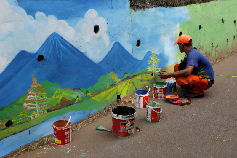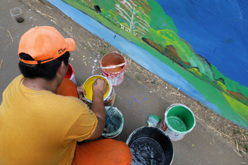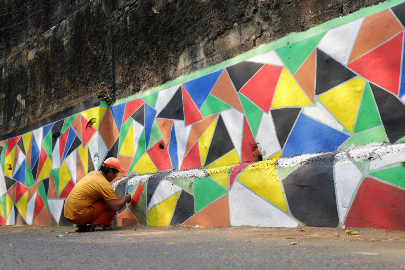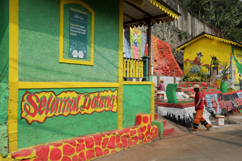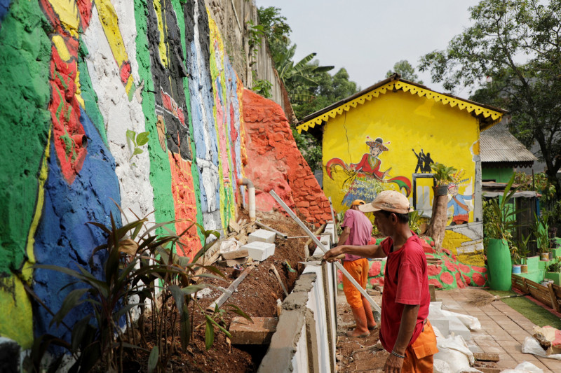 Petugas Penanganan Prasarana dan Sarana Umum (PPSU) Bangka melakukan penataan kawasan di Jalan Kemang Selatan X, Bangka, Mampang Prapatan, Jakarta Selatan, Senin (18/9). Penataan kawasan triwulan ketiga pada lahan seluas 25 meter tersebut berupa pembuatan mural, pembersihan saluran, pemasangan tong sampah pilah serta pembuatan panggung latihan sanggar manggar kelape.