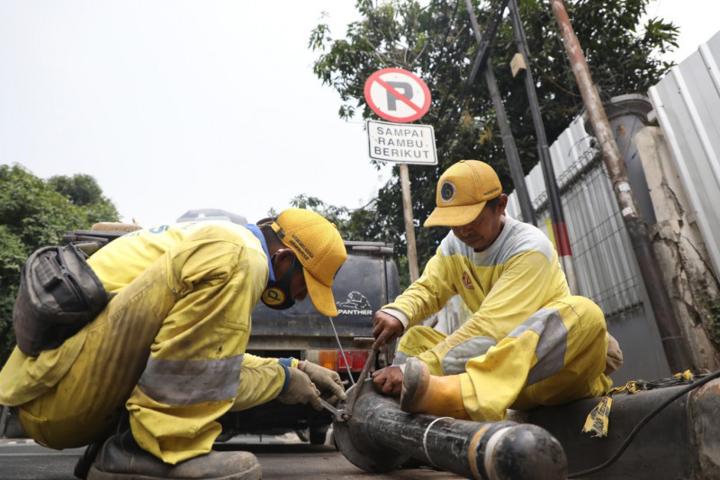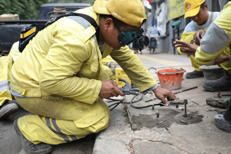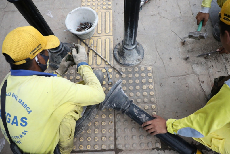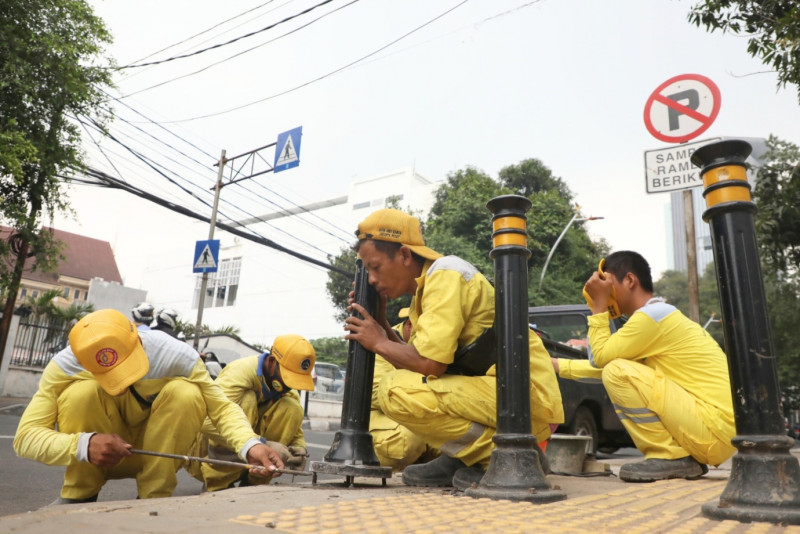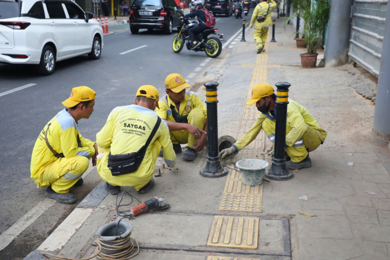 Petugas Suku Dinas (Sudin) Bina Marga Jakarta Pusat memperbaiki tiang pengaman trotoar (Bollard) di Jalan Cik Ditiro, Menteng, Jakarta Pusat, Selasa (19/9). Perbaikan dilakukan sejak 18 September dan rampung pada 20 September 2023.
