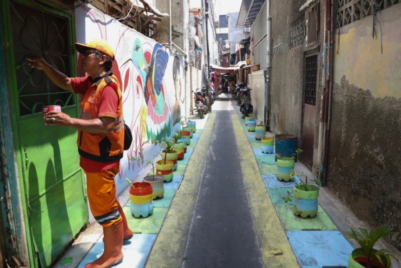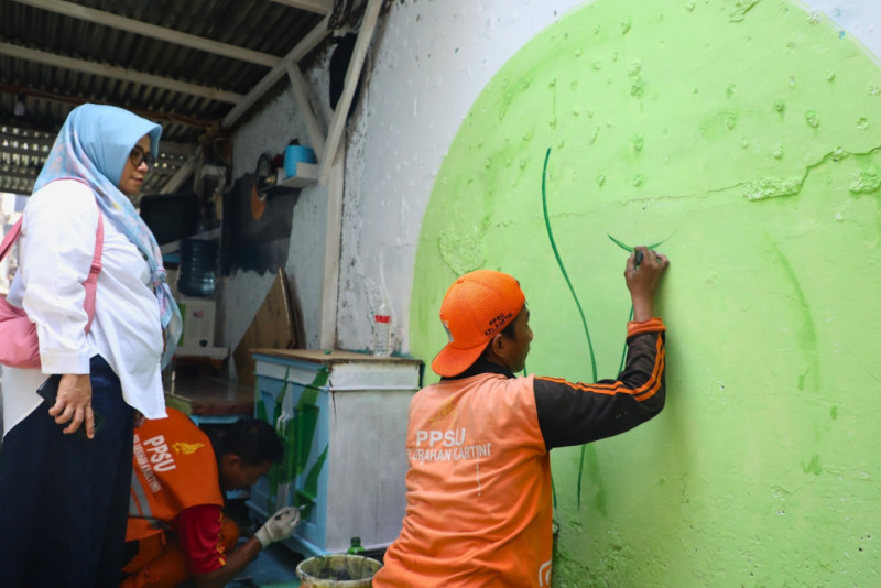 Petugas Penanganan Prasarana dan Sarana Umum (PPSU) Kelurahan Kartini mempercantik lingkungan dengan membuat mural di Jalan Kartini 3, RW 05/09, Kecamatan Sawah Besar, Jakarta Pusat, Rabu (20/9). Pembuatan mural ini selain mempercantik lingkungan juga merupakan salah satu program penataan kawasan triwulan ketiga.
