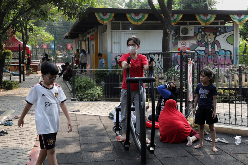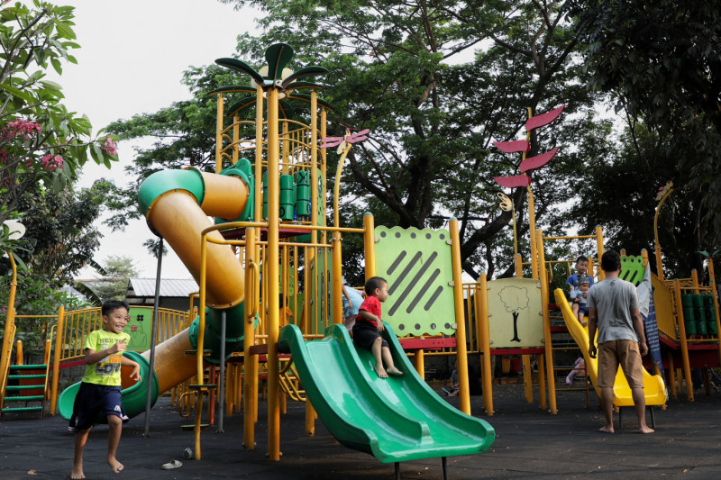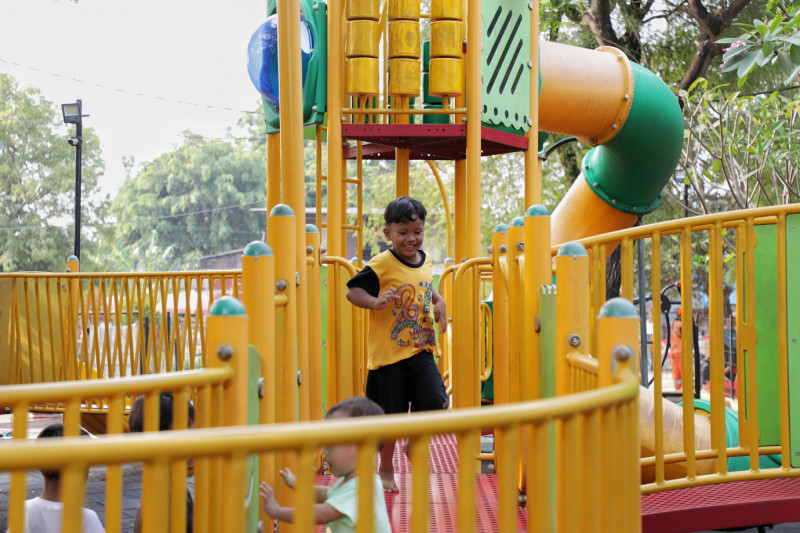 Sejumlah anak bermain di Ruang Publik Terpadu Ramah Anak (RPTRA) Bhineka, Jalan Swadarma, RT 06/04, Petukangan Utara, Pesanggrahan, Jakarta Selatan. RPTRA seluas 3.000 meter persegi ini dilengkapi dengan Children Play Ground yang membuat anak-anak semakin betah bermain.