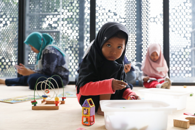 Sejumlah anak-anak dari Bale Buku Jakarta mengunjungi Perpustakaan Jakarta di Taman Ismail Marzuki (TIM), Menteng, Jakarta Pusat, Sabtu (23/9). Dalam kunjungannya ke Perpustakaan Jakarta, anak-anak mendengarkan dongeng dan bermain permainan edukatif di area bermain anak.
