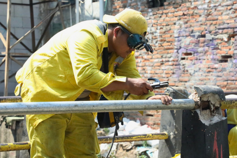 Petugas Satuan Pelaksana (Satpel) Bina Marga Kecamatan Menteng melakukan perbaikan jembatan penghubung antarkampung di RW 01 dan RW 08 di Kelurahan Menteng, Jakarta Pusat, Senin (25/9). Dalam perbaikan ini lima petugas dikerahkan untuk memperbaiki dinding pelindung dan bagian pembatas jembatan. Dengan adanya perbaikan ini diharapkan memberikan keamanan dan kenyamanan bagi warga yang melintas di jembatan.