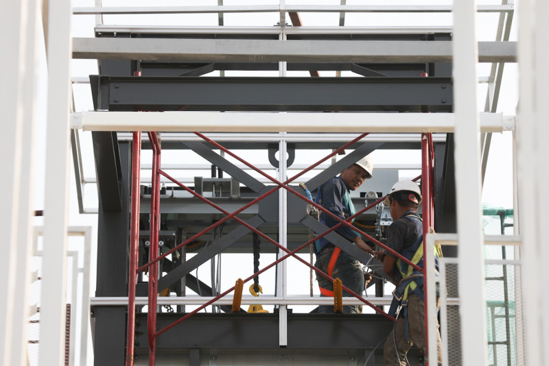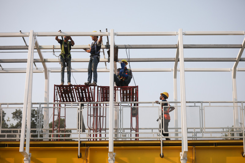 Sejumlah pekerja mengerjakan proyek pembangunan jembatan penyeberangan orang (JPO) Soepomo di Jalan Prof Dr Soepomo, Tebet, Jakarta Selatan, Selasa (26/9). Pembangunan JPO yang dilengkapi dengan sejumlah fasilitas penunjang itu ditargetkan selesai pada bulan Oktober 2023.