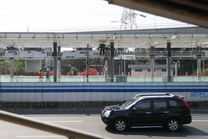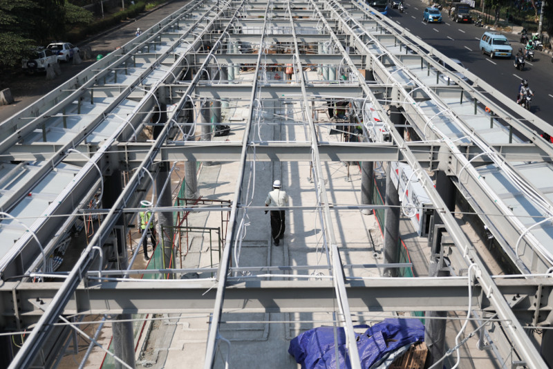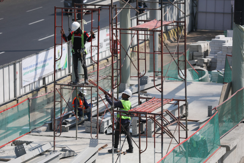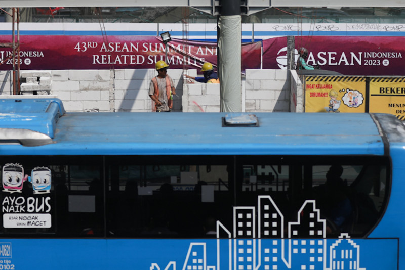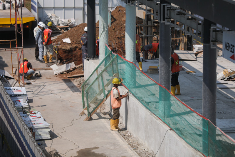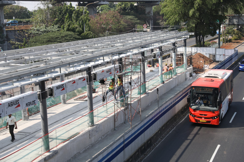Sejumlah pekerja mengerjakan proyek revitalisasi Halte Transjakarta Cawang UKI di Jalan Mayjen Sutoyo, Kecamatan Kramat Jati, Jakarta Timur, Rabu (27/9). PT Transportasi Jakarta (Transjakarta) merevitalisasi 10 halte sejak bulan Mei 2023 di sejumlah wilayah untuk menambah kapasitas penumpang dan fasilitas penunjang.