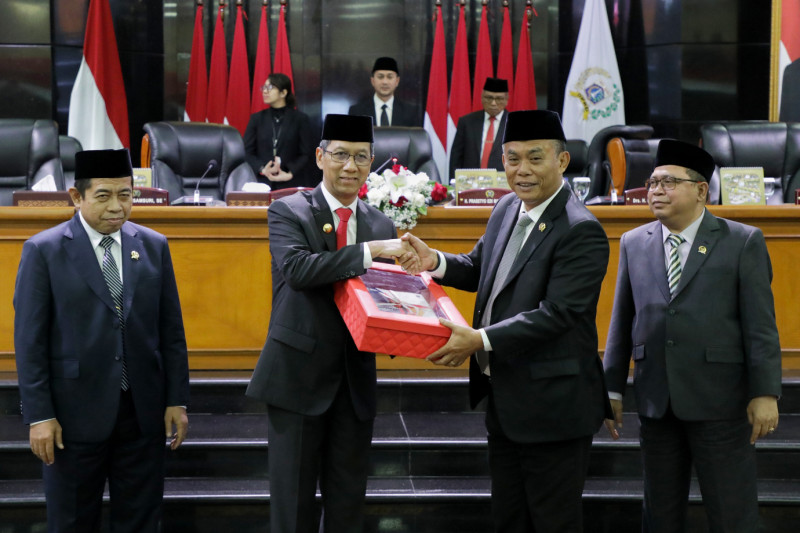 DPRD DKI Jakarta menggelar rapat paripurna dalam rangka penyampaian laporan hasil pembahasan badan anggaran dan penandatangan persetujuan bersama raperda tentang perubahan APBD 2023, di ruang rapat Paripurna DPRD DKI Jakarta, Rabu (27/9). Rapat paripurna ini dipimpin Ketua DPRD DKI Jakarta, Prasetio Edi Marsudi dan dihadiri Penjabat Gubernur DKI Jakarta, Heru Budi Hartono.