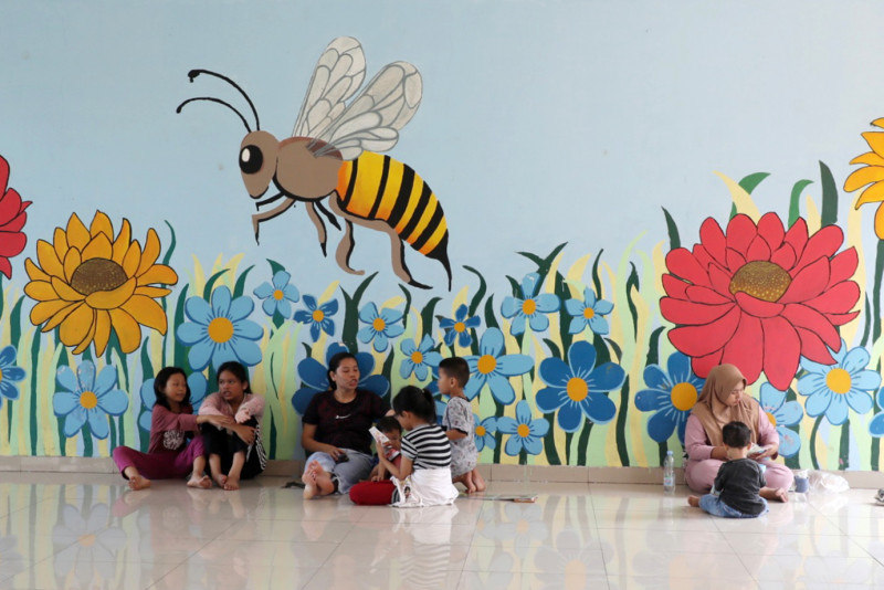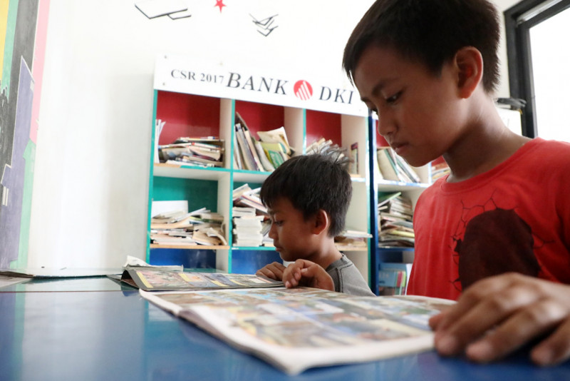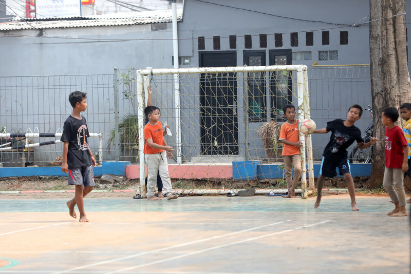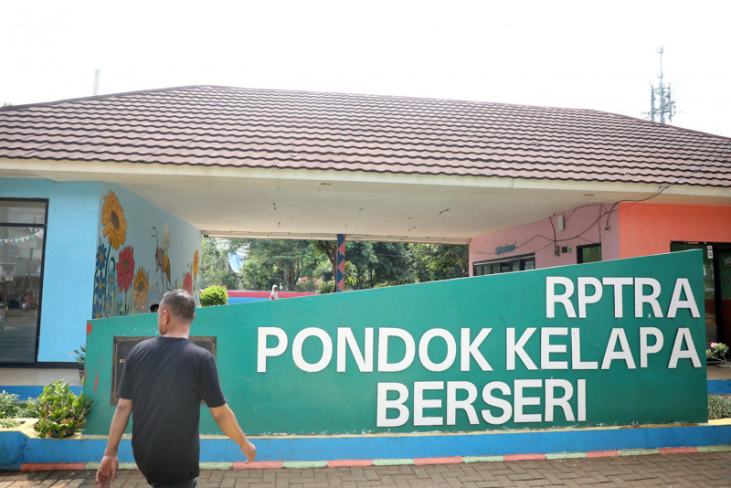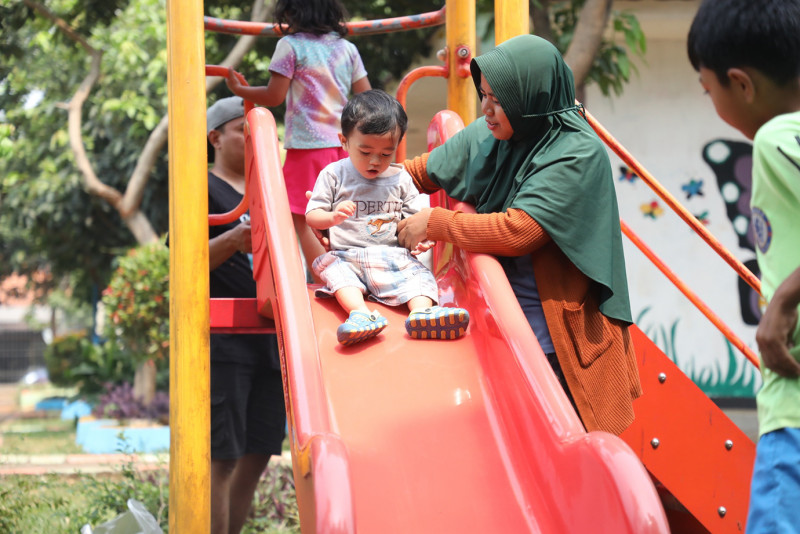 Sejumlah warga menikmati waktu akhir pekan dengan mengunjungi Ruang Publik Terpadu Ramah Anak (RPTRA) Pondok Kelapa Berseri, Pondok Kelapa, Duren Sawit, Jakarta Timur, Minggu (1/10). Di RPTRA seluas 1.700 meter persegi ini, pengunjung dapat menikmati beragam fasilitas menarik mulai dari wahana bermain, sarana olahraga, hingga perpustakaan.