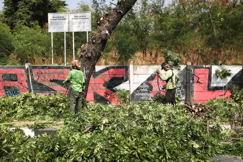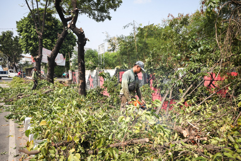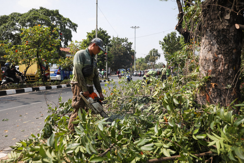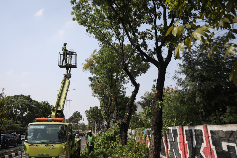 Petugas Suku Dinas Pertamanan dan Hutan Kota (Sudin Tamhut) Jakarta Timur melakukan pemangkasan pohon di sepanjang Jalan Raden Inten II, Duren Sawit, Jakarta Timur, Selasa (3/10). Pemangkasan dilakukan untuk antisipasi terjadinya pohon tumbang saat musim hujan.