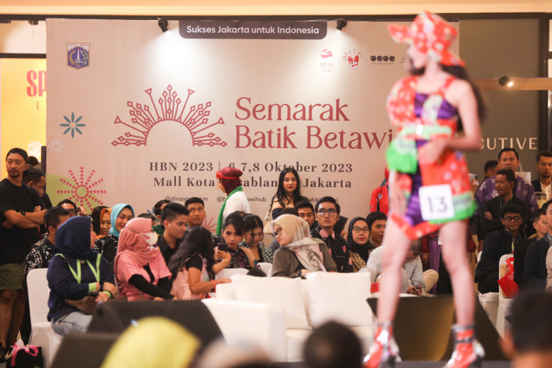 Semarak Batik Betawi 2023 di Mal Kota Kasablanka, Jakarta Selatan, Sabtu (7/10), dimeriahkan Fashion Show oleh Aparatur Sipil Negara (ASN) Pemerintah Provinsi (Pemprov) DKI Jakarta. Semarak Batik Betawi yang diinisiasi Dinas Perindustrian, Perdagangan, Koperasi, Usaha Kecil, dan Menengah (PPKUKM) DKI Jakarta berlangsung mulai 6-8 Oktober 2023.