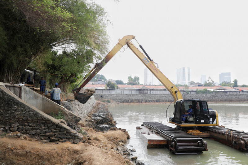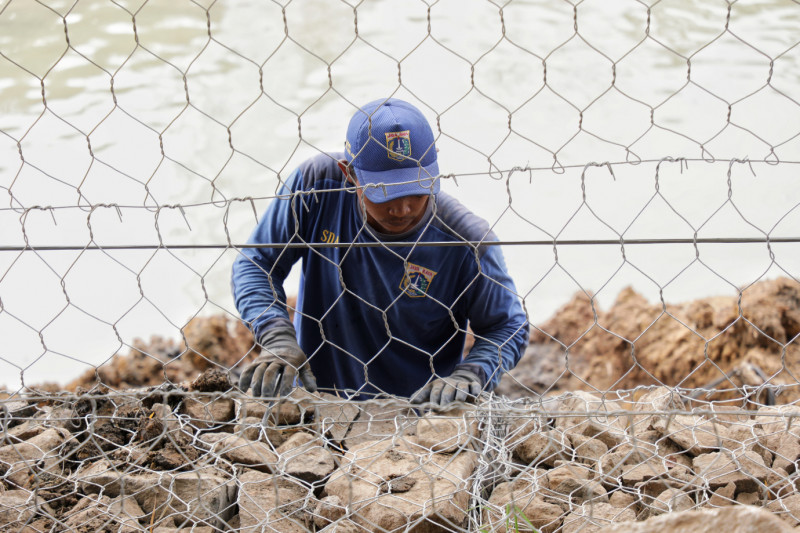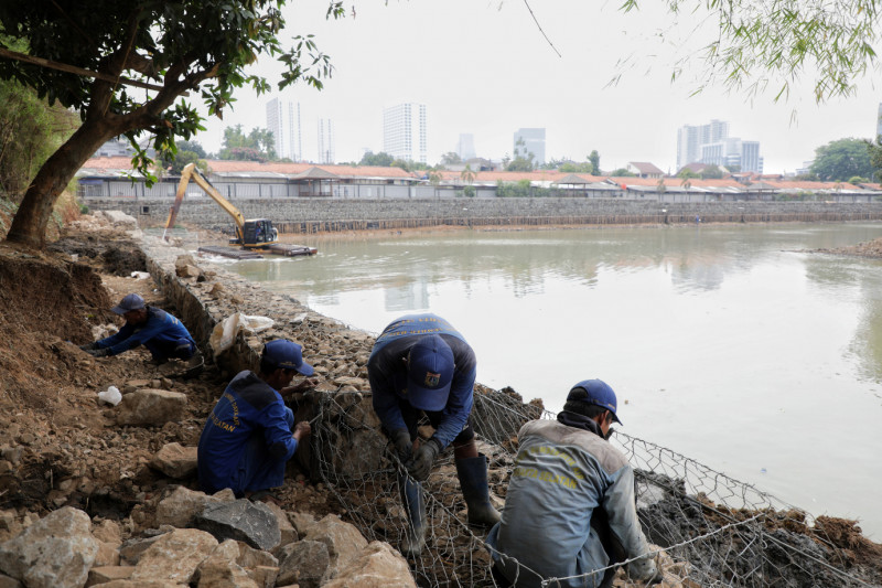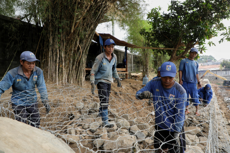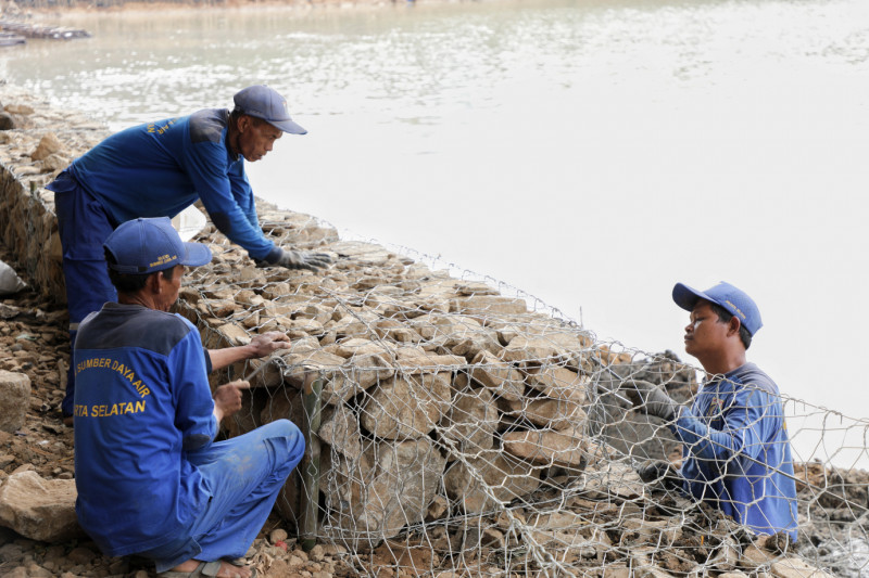 Suku Dinas Sumber Daya Air (Sudin SDA) Jakarta Selatan melakukan pemasangan turap bronjong di Waduk Marinir Denjaka, Cilandak Timur, Pasar Minggu, Jakarta Selatan, Senin (9/10). Pemasangan bronjong dilakukan pada sisi selatan waduk, dengan total pengerjaan sepanjang 274 meter serta ketinggian 3 meter.