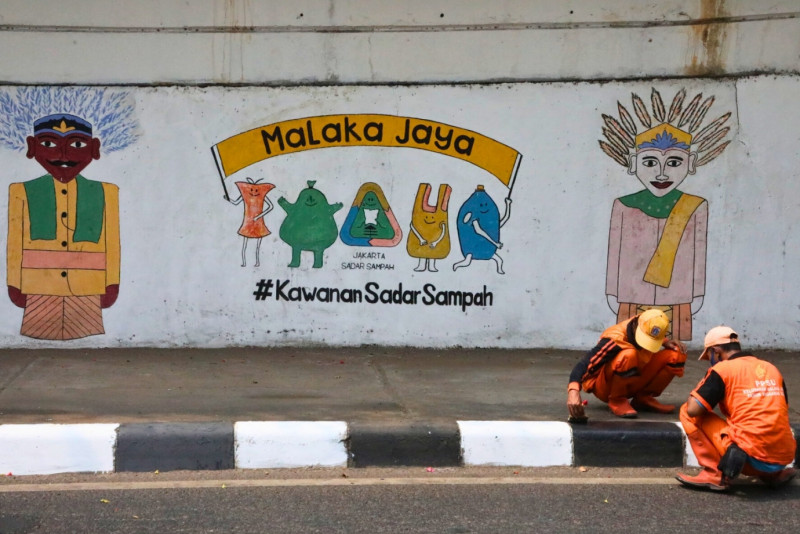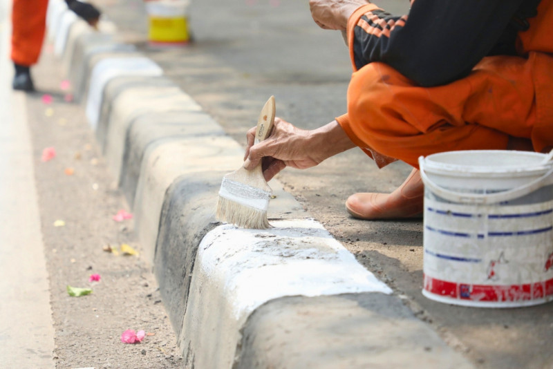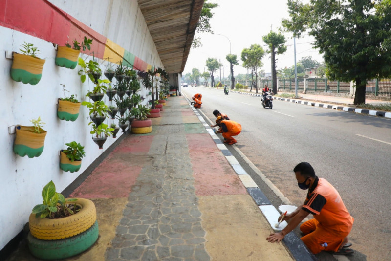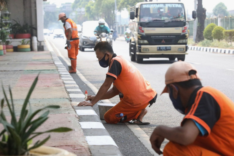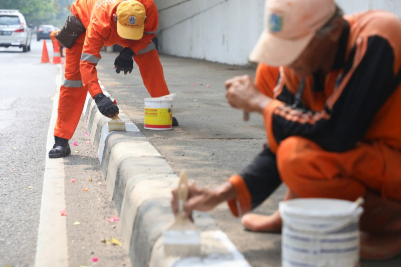 Petugas Penanganan Prasarana dan Sarana Umum (PPSU) Kelurahan Malaka Jaya melakukan pengecatan kanstin di Jalan I Gusti Ngurah Rai, Duren Sawit, Jakarta Timur, Senin (9/10). Pengecatan sepanjang 769 meter dikerjakan oleh 10 petugas dari 7 Oktober hingga 11 Oktober 2023.