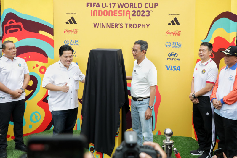 Pj Gubernur DKI Jakarta, Heru Budi Hartono bersama Ketua Umum PSSI, Erick Thohir membuka pameran trofi Piala Dunia U-17 pada hari bebas kendaraan bermotor (HBKB) di Bundaran HI, Menteng, Jakarta Pusat, Minggu (15/10). Pameran trofi ini digelar agar masyarakat dapat merasakan atmosfer dari perhelatan bergengsi Piala Dunia U-17 di Indonesia secara lebih dekat.