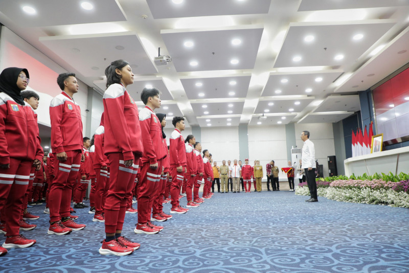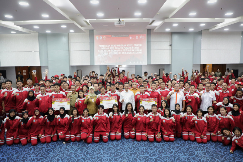 Penjabat (Pj) Gubernur DKI Jakarta, Heru Budi Hartono menyerahkan piagam penghargaan beserta uang apresiasi kepada atlet kontingen DKI Jakarta di Ruang Pola, Balai Kota DKI Jakarta, Jalan Medan Merdeka Selatan, Gambir, Jakarta Pusat, Selasa (17/10). Apresiasi tersebut diberikan kepada seluruh kontingen DKI Jakarta yang berhasil meraih juara umum di ajang Pekan Olahraga Pelajar Nasional (POPNAS) XVI di Sumatera Selatan.