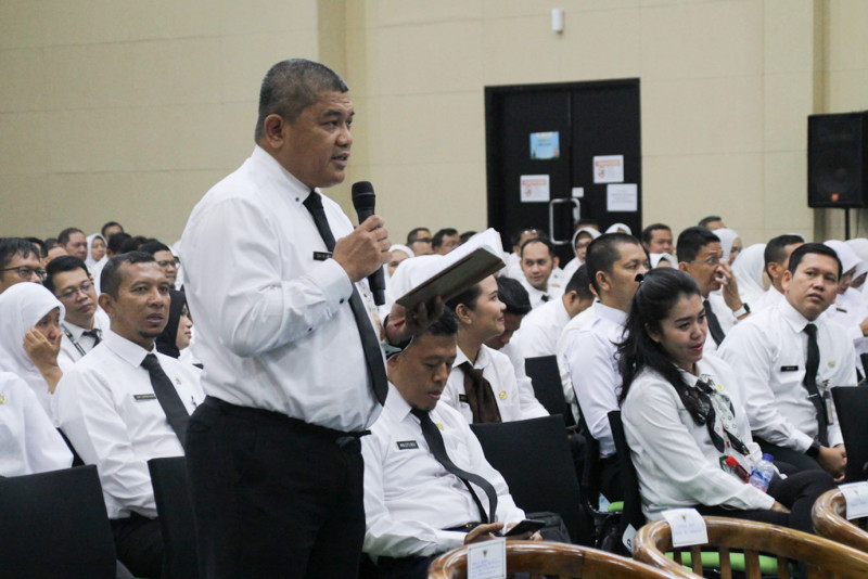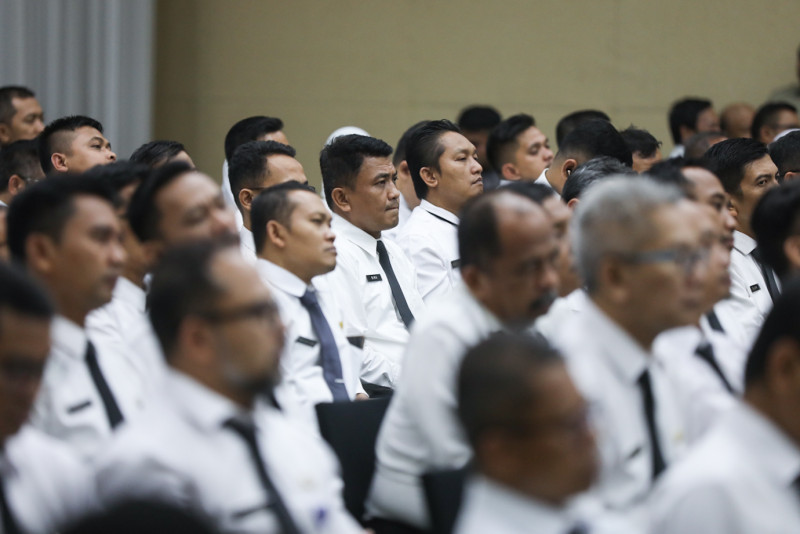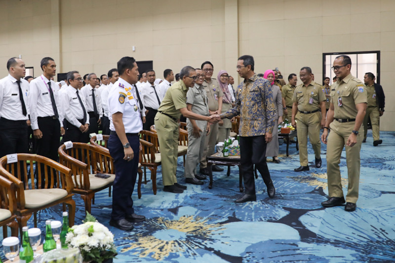 Badan Pengembangan Sumber Daya Manusia (BPSDM) Provinsi DKI Jakarta menggelar kegiatan peningkatan kompetensi kepemimpinan Aparatur Sipil Negara (ASN) bagi peserta Pela tihan Kepemimpinan Administrator (PKA) dan Pelatihan Kepemimpinan Pengawas (PKP) Tahun 2023 di Aula Ki Hajar Dewantara, Gedung Dinas Pendidikan, Setiabudi, Jakarta Selatan, Selasa (17/10). Dalam kegiatan ini Penjabat (Pj) Gubernur DKI Jakarta, Heru Budi Hartono, meminta ASN peserta kegiatan peningkatan kompetensi untuk fokus bekerja melayani masyarakat sesuai tugasnya masing-masing.