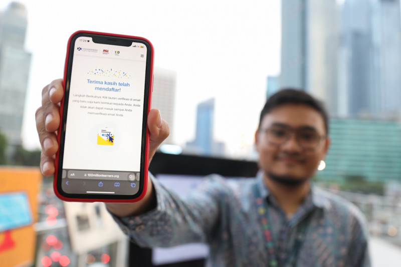 PT Transjakarta bersama Thunderbird School of Global Management, Arizona State University melakukan penandatanganan nota kesepahaman dalam program 100 Million Learners di Halte Bundaran HI, Menteng, Jakarta Pusat, Kamis (19/10). Kerja sama ini dilakukan untuk meningkatkan kualitas SDM PT Transjakarta melalui akses-akses pelatihan yang berkualitas dan setara kepada seluruh karyawan dan pelanggan bus menggunakan platform program 100 Million Learners.
