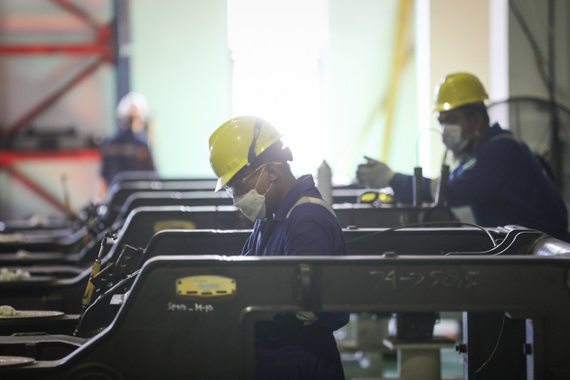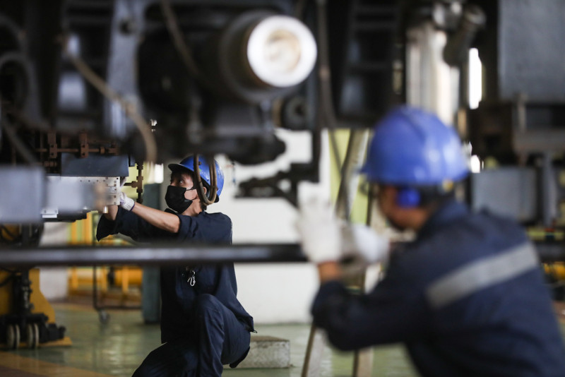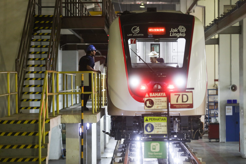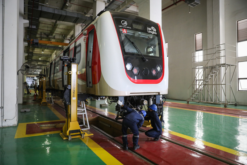 Sejumlah teknisi melakukan perawatan kereta LRT Jakarta atau light rail vehicle (LRV) di Depo LRT Jakarta Pegangsaan Dua, Kelapa Gading, Jakarta, Utara. Kereta LRT Jakarta menjalani dua jenis perawatan rutin, yaitu perawatan ringan (light maintenance) yang dilakukan setiap 7 hari dan 4 bulan, serta perawatan berat (heavy maintenance) yang dilakukan setiap 4 dan 8 tahun oleh Divisi Sarana LRT Jakarta.