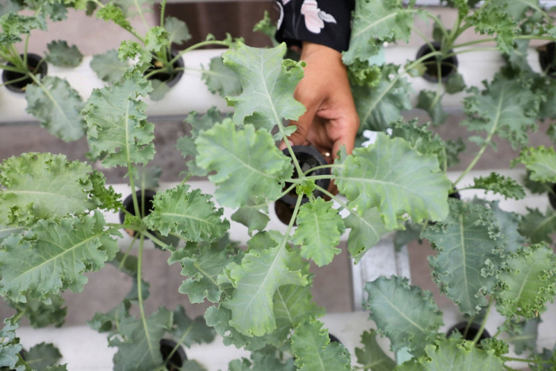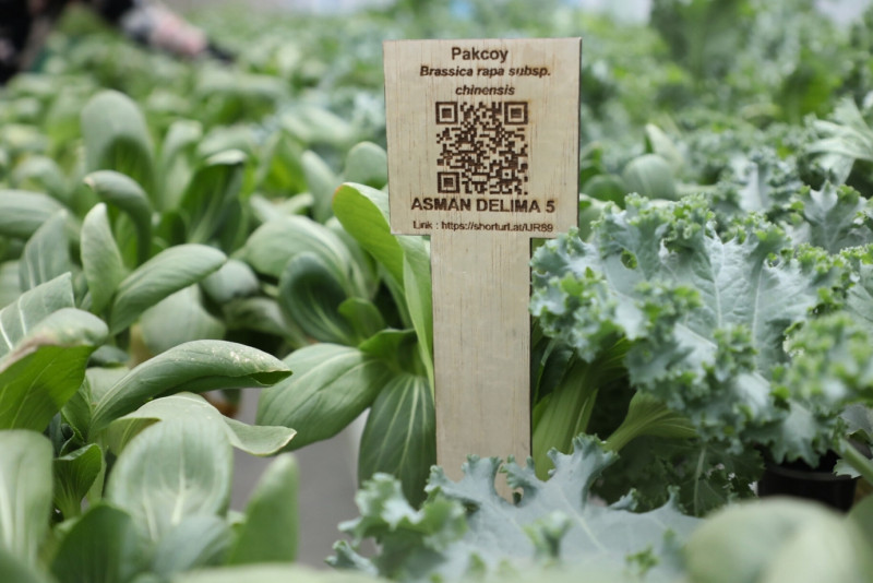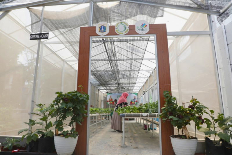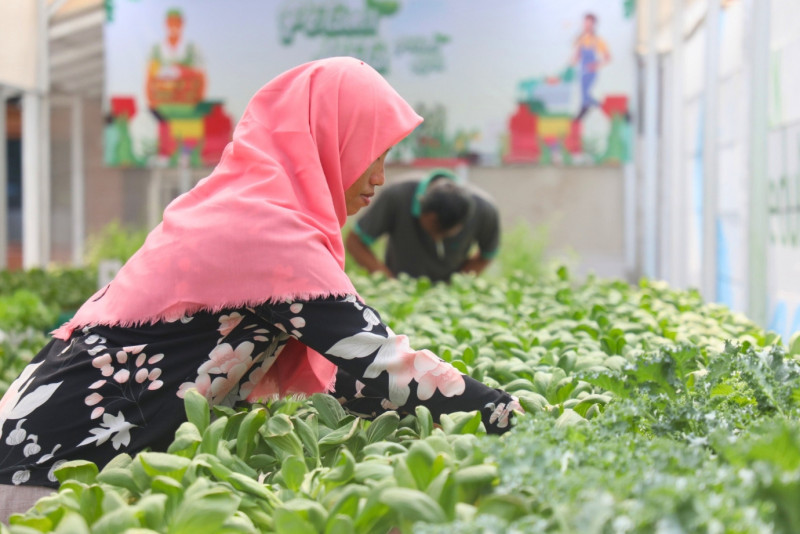 Melihat Green House Tanaman Hidroponik di Malakasari Edu Farm milik Kelompok Wanita Tani (KWT) D\' Shafa di Jalan Wijaya Kusuma, Duren Sawit, Jakarta Timur, Jumat (20/10). Gren House yang memiliki panjang 18 meter dan lebar 5 meter ini ditanami berbagai tanaman seperti tanaman kale, pakcoy, seledri, kangkung, daun mint dan, Bayam Hijau.