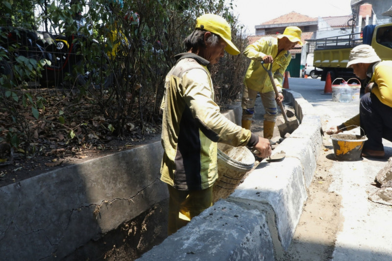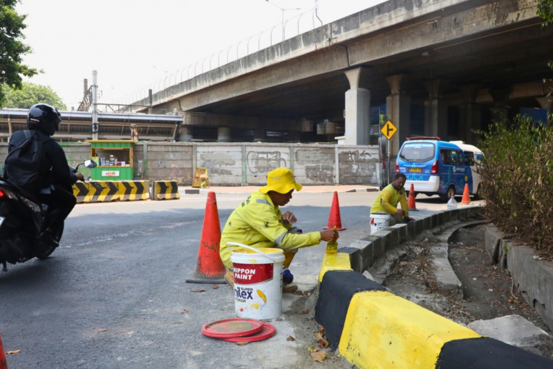 Petugas Suku Dinas (Sudin) Bina Marga Jakarta Timur memperbaiki kanstin di Jalan Raya Stasiun Cakung, Pulo Gebang, Sabtu (21/10). Perbaikan kanstin ini dilakukan karena banyak kanstin yang rusak akibat tertabrak kendaraan. Dengan adanya perbaikan ini diharapkan dapat memberikan kenyamanan dan keamanan bagi pengendara yang melintas.