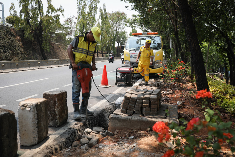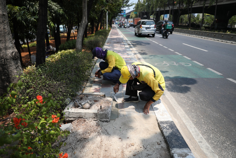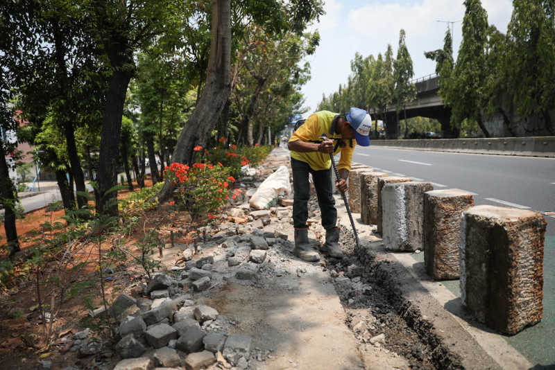 Petugas Suku Dinas Bina Marga Jakarta Timur mengerjakan revitalisasi trotoar di Jalan Jenderal Ahmad Yani, Matraman, Jakarta Timur, Senin (23/10). Revitalisasi meliputi peninggian badan trotoar dan pemasangan paving block untuk memberikan keamanan dan kenyamanan bagi pejalan kaki.