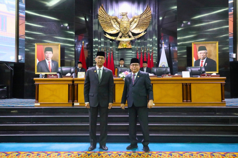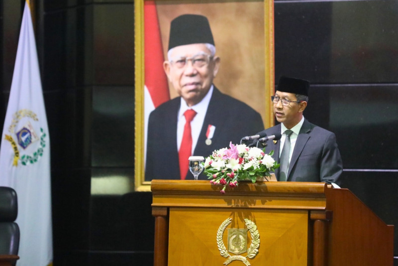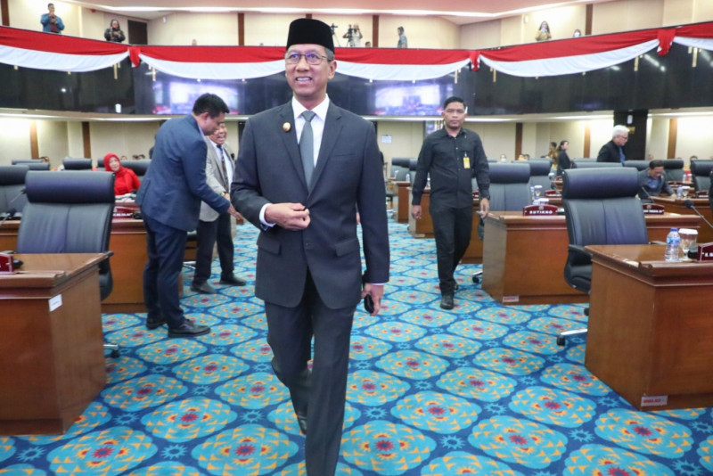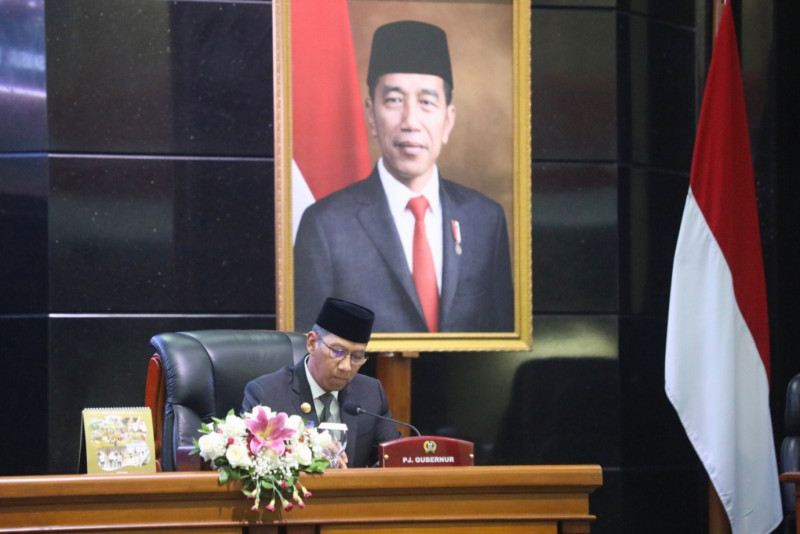 Penjabat Gubernur (Pj) DKI Jakarta, Heru Budi Hartono menghadiri Rapat Paripurna DPRD DKI Jakarta di Ruang Rapat Paripurna DPRD DKI Jakarta, Senin (23/10). Paripurna ini beragendakan penyampaian Penjelasan Pj Gubernur tentang empat Rancangan Peraturan Daerah (Raperda) antara lain Raperda